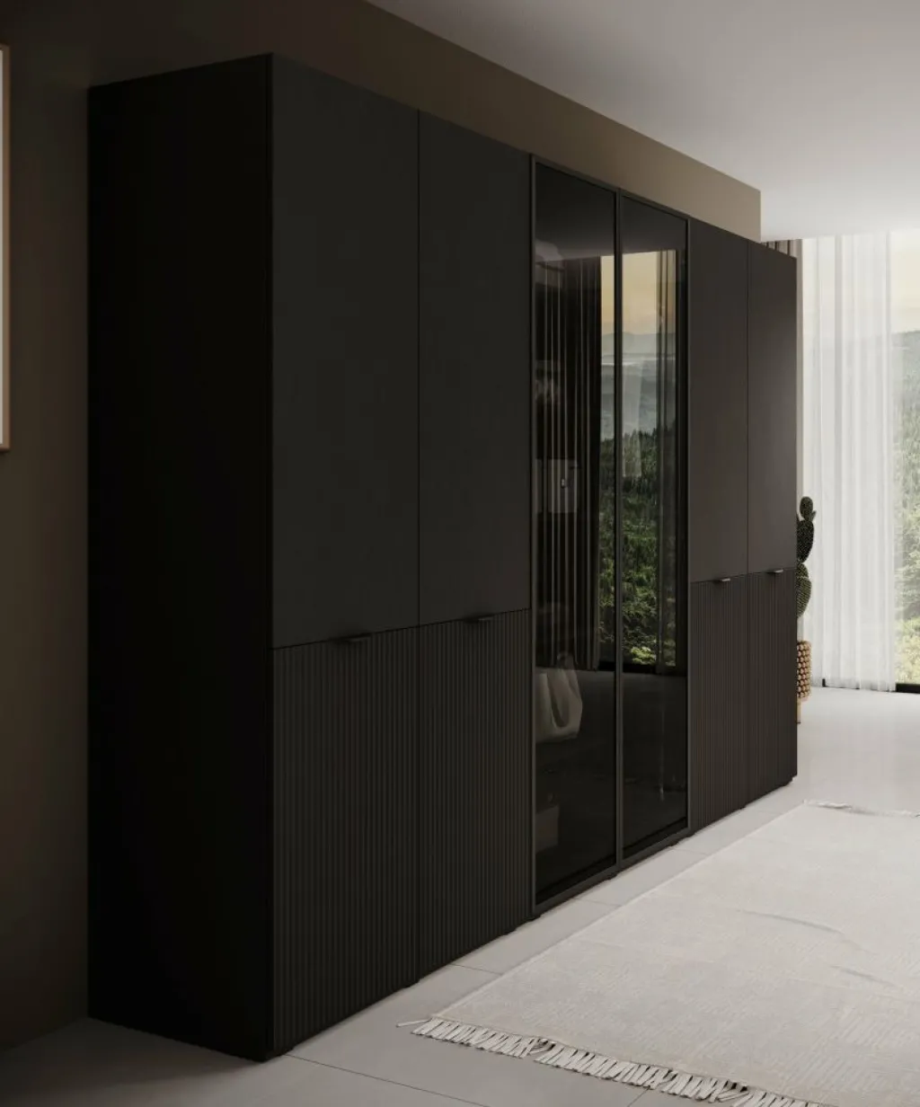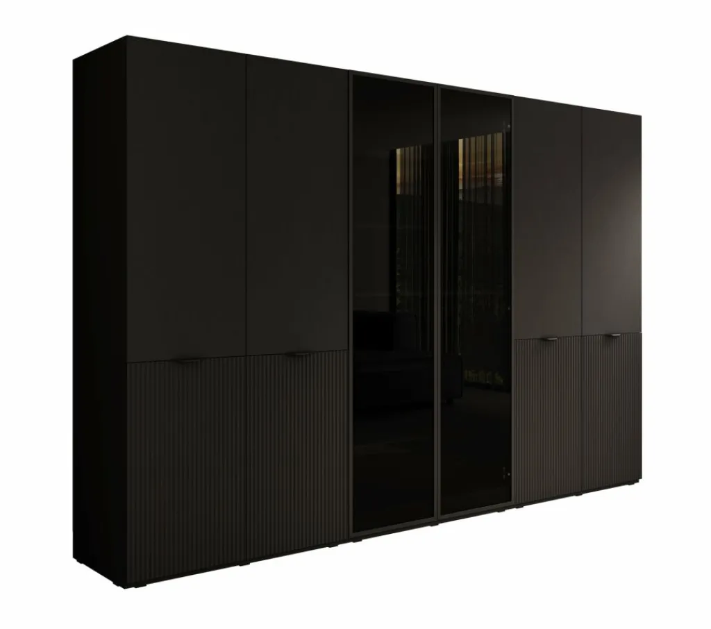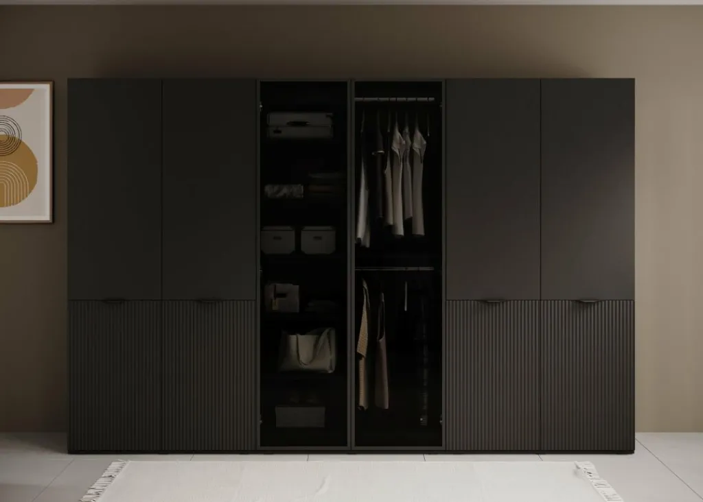 De Kledingkast Shelton biedt een royale opbergruimte verdeeld over drie kastelementen. Het middelste deel is voorzien van twee zwarte glazen draaideuren met daarachter legplanken en een hanggedeelte. De twee buitenste delen hebben elk vier deuren, waarvan de onderste helft een verticale reliƫfstructuur heeft. Achter deze deuren vind je meerdere legplanken en dubbele hanggedeeltes, geschikt voor het overzichtelijk opbergen van kleding, schoenen en accessoires.