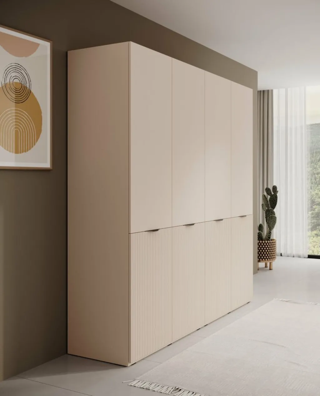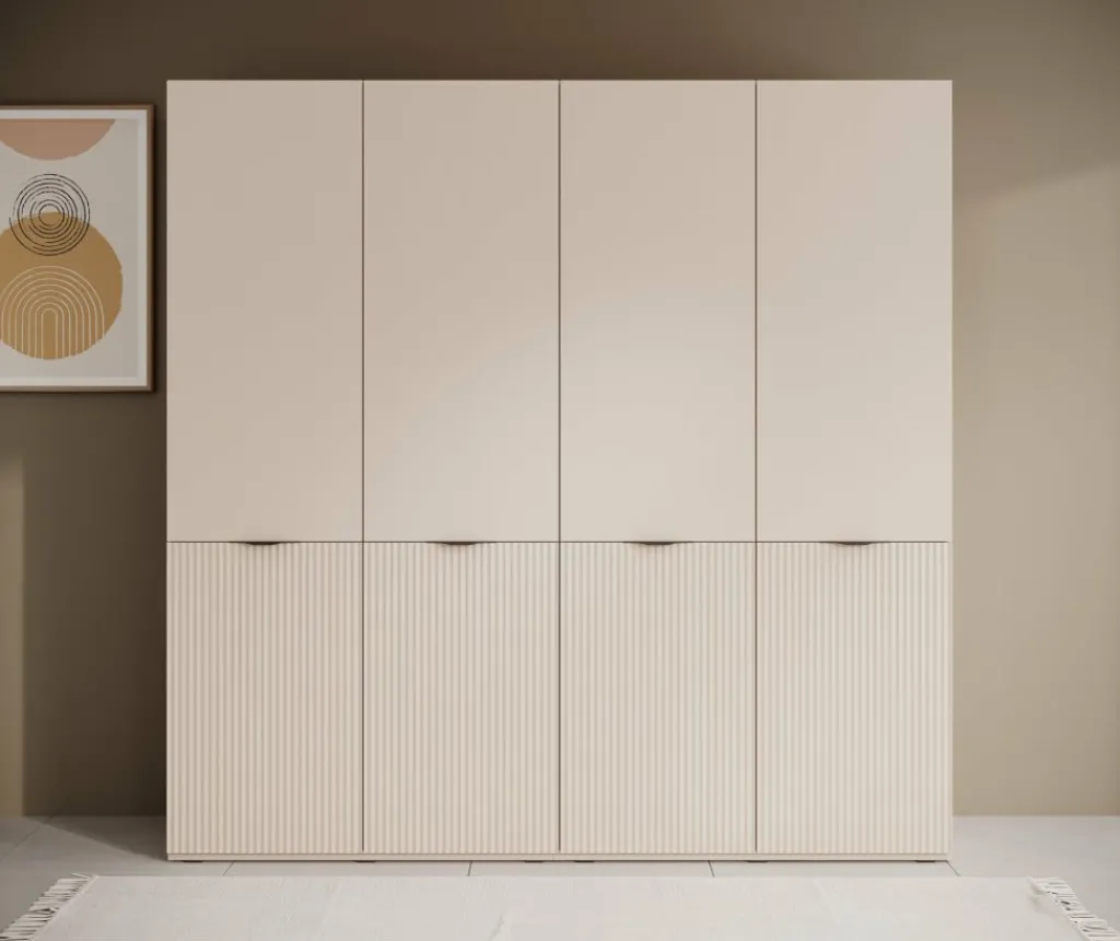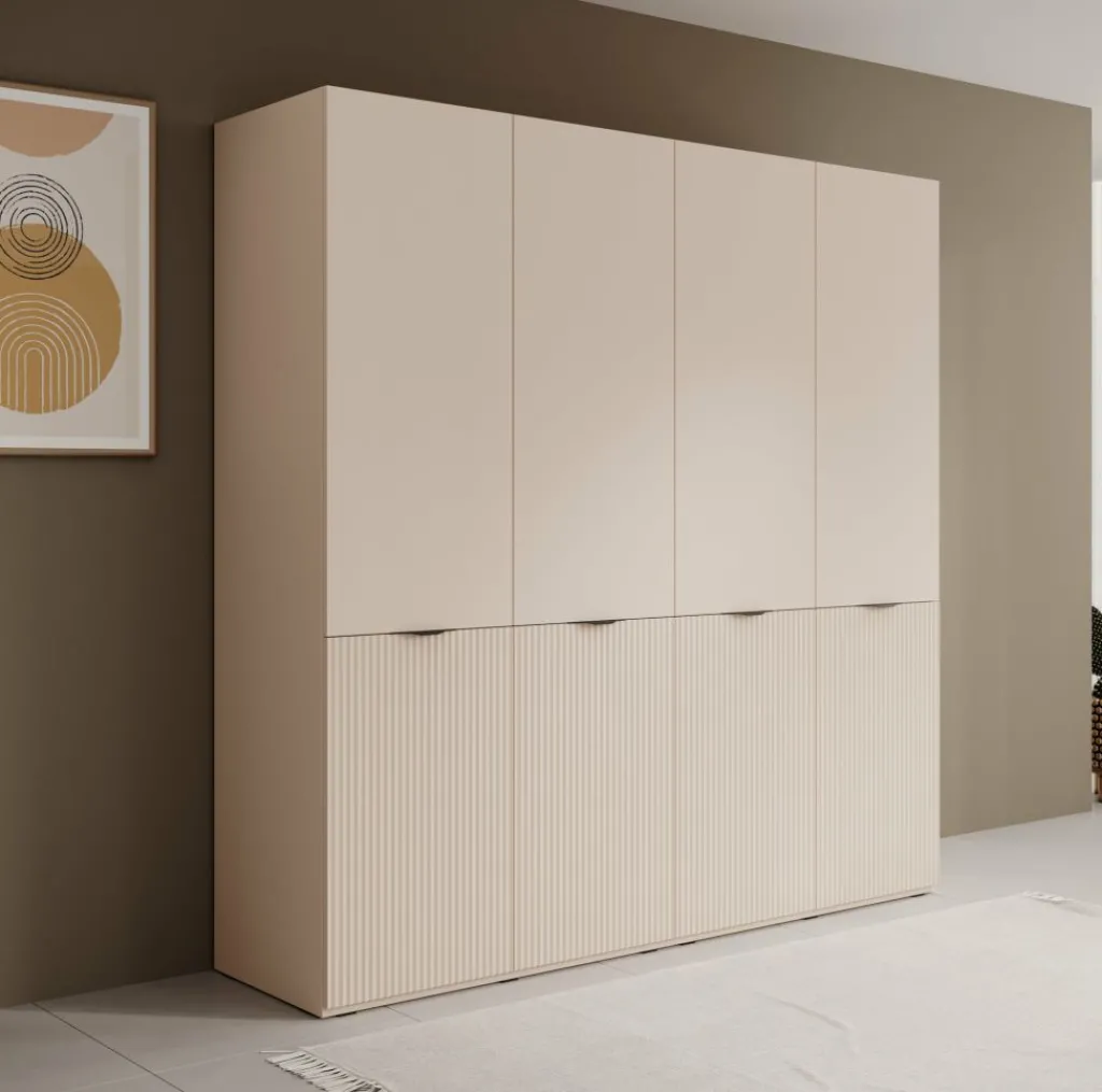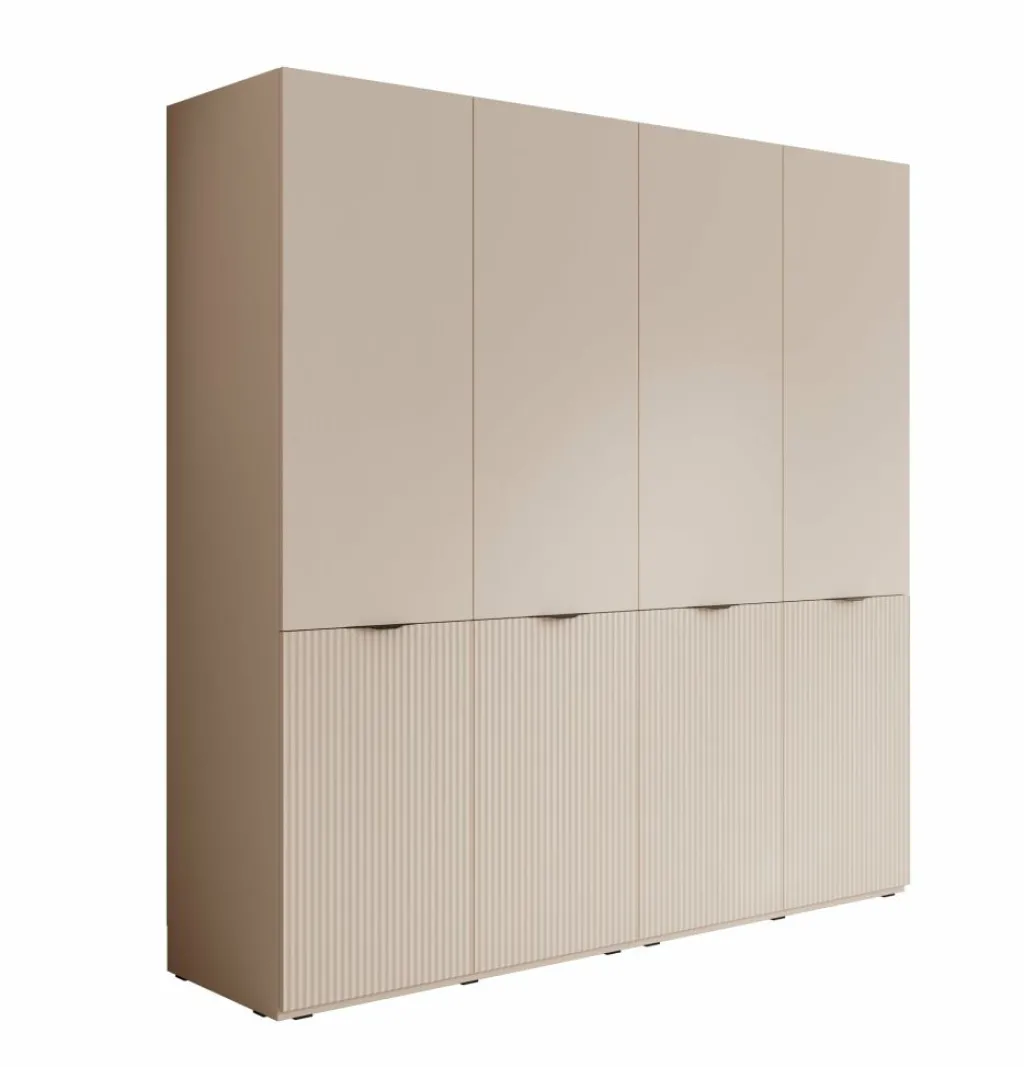 De Kledingkast Shelton biedt veel opbergruimte in een strak vormgegeven ontwerp. De kast is uitgevoerd in beige met verticale lijnen op de onderste deuren voor een subtiel accent. Met een breedte van 202 cm en een hoogte van 200 cm is dit een ruime oplossing voor het opbergen van kleding en accessoires.