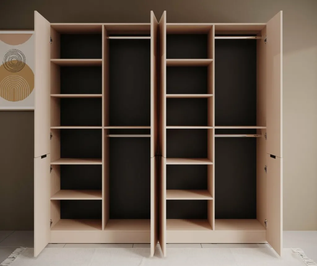 Achter de vier draaideuren vind je een praktische combinatie van legplanken en hangruimte. De kast beschikt over meerdere vakken van verschillende hoogtes, waardoor er plaats is voor zowel gevouwen kleding als grotere items. Daarnaast zijn er twee roedes voor het ophangen van shirts, jurken en jassen.