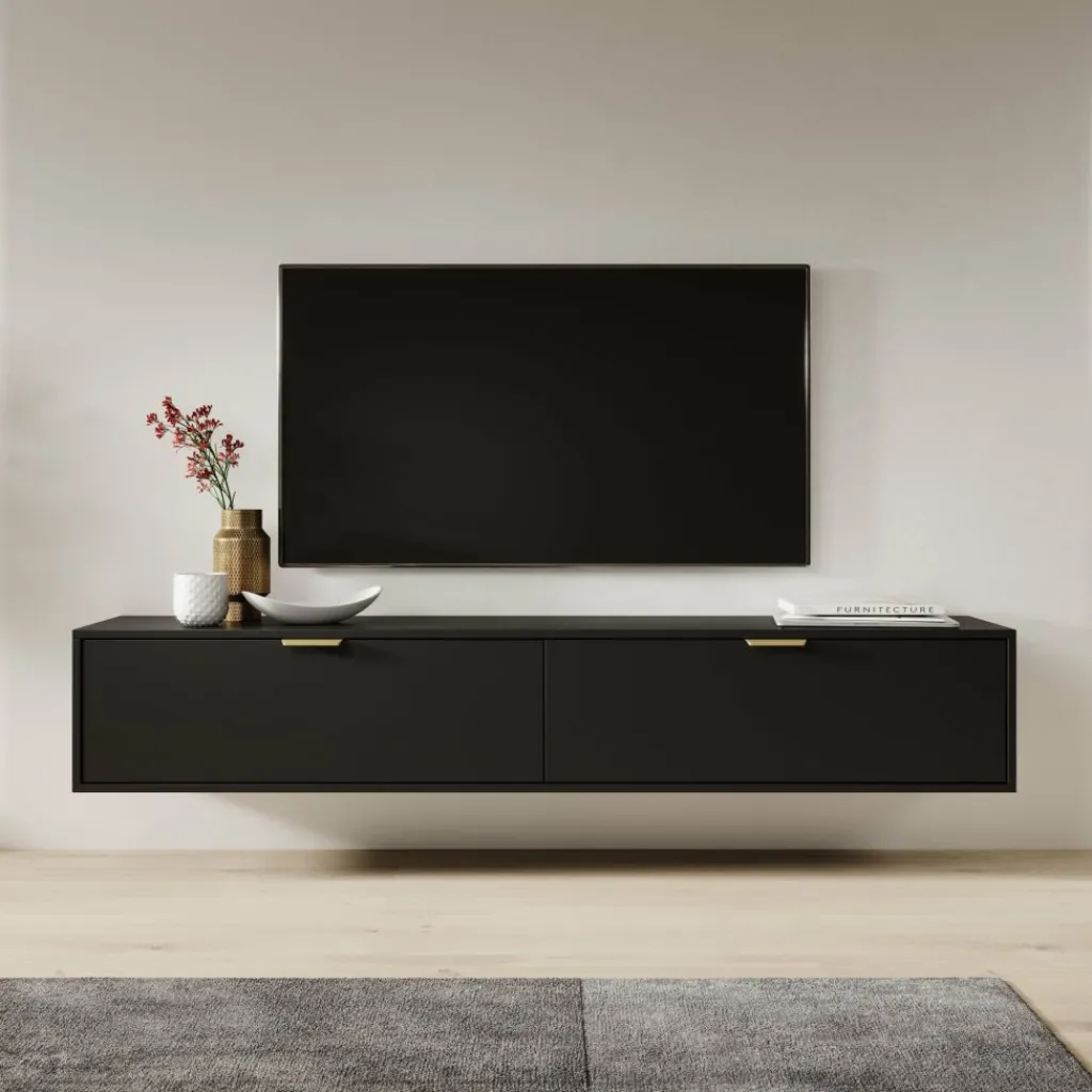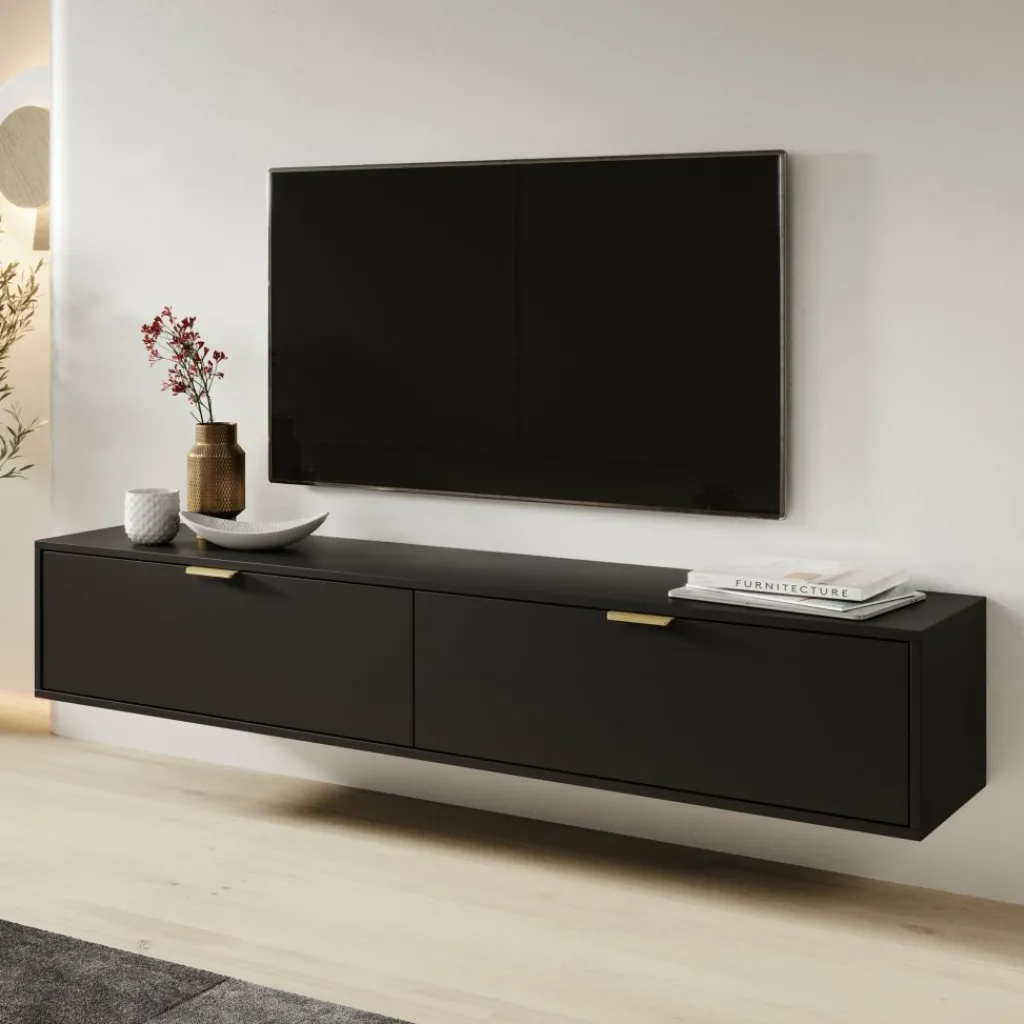 Breng luxe en modern design samen in jouw woonkamer met het Silas TV-meubel in zwart. Dit stijlvolle zwevende meubel van 175 cm breed biedt niet alleen voldoende ruimte voor je televisie, maar ook praktische opbergruimte.