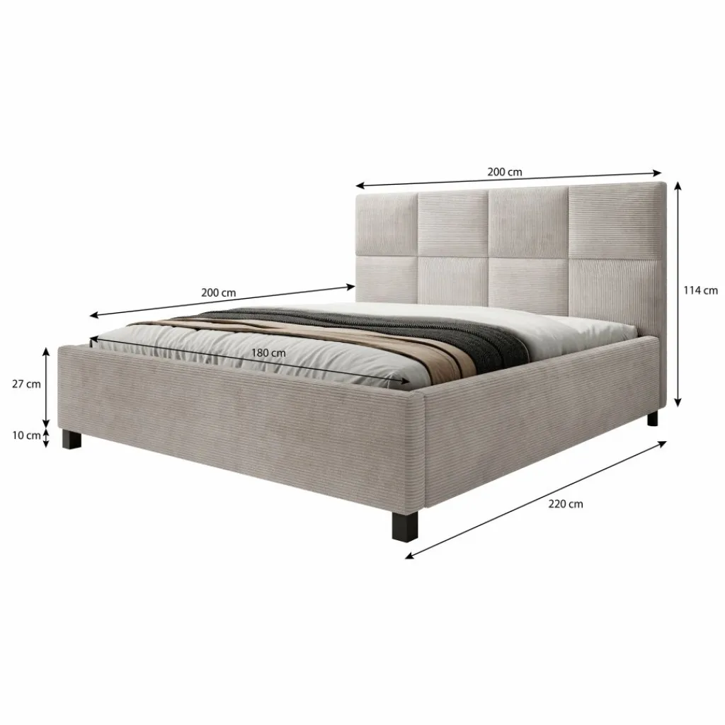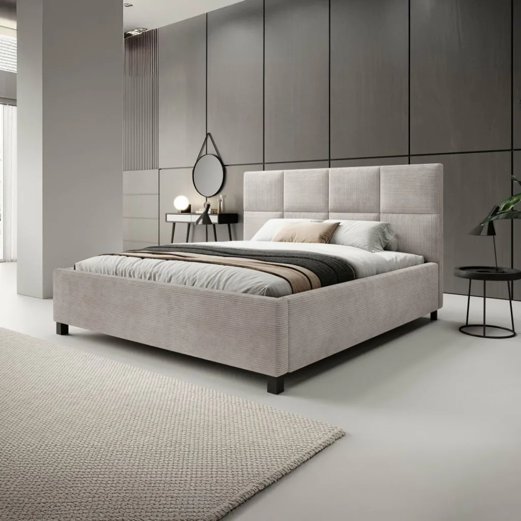 Het tweepersoonsbed Soline combineert eigentijds design met een luxueuze uitstraling. Bekleed in een zachte ribstof in beige, straalt dit bed warmte en elegantie uit, passend in zowel moderne als klassieke slaapkamers.