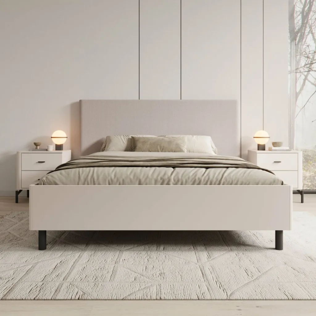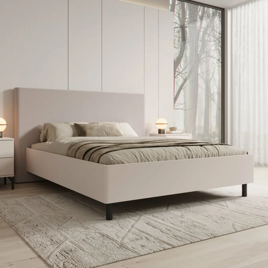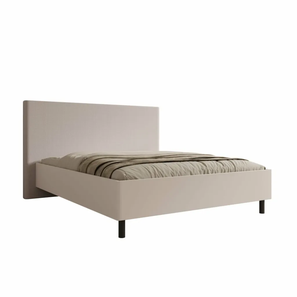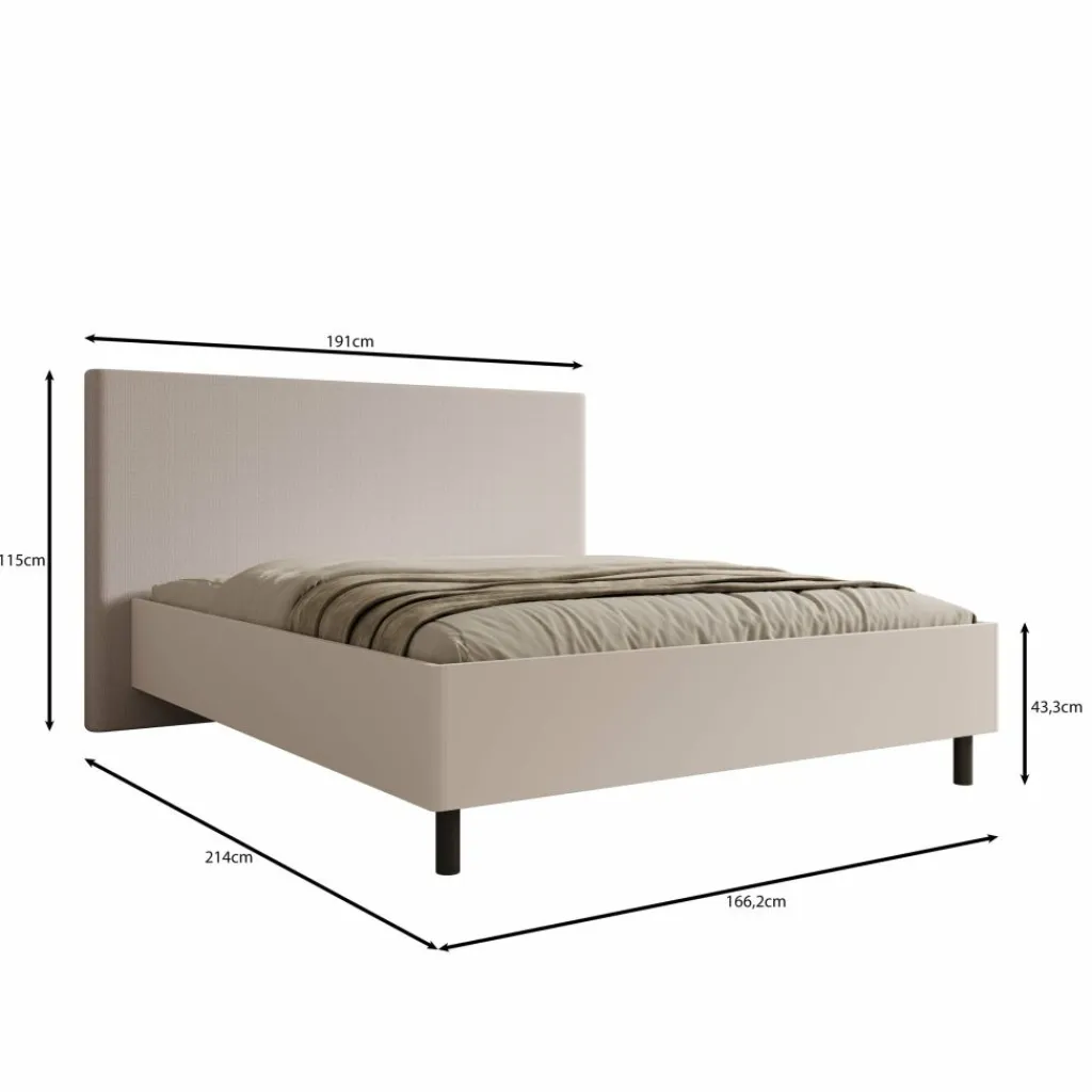 Het bedframe is stevig opgebouwd en staat op slanke zwarte poten, waardoor het bed vrij van de vloer staat. Dit geeft extra ruimte onder het bed en draagt bij aan een overzichtelijke indeling van de slaapkamer. De beige bekleding vormt een neutrale basis die eenvoudig te combineren is met verschillende kleuren en materialen.
