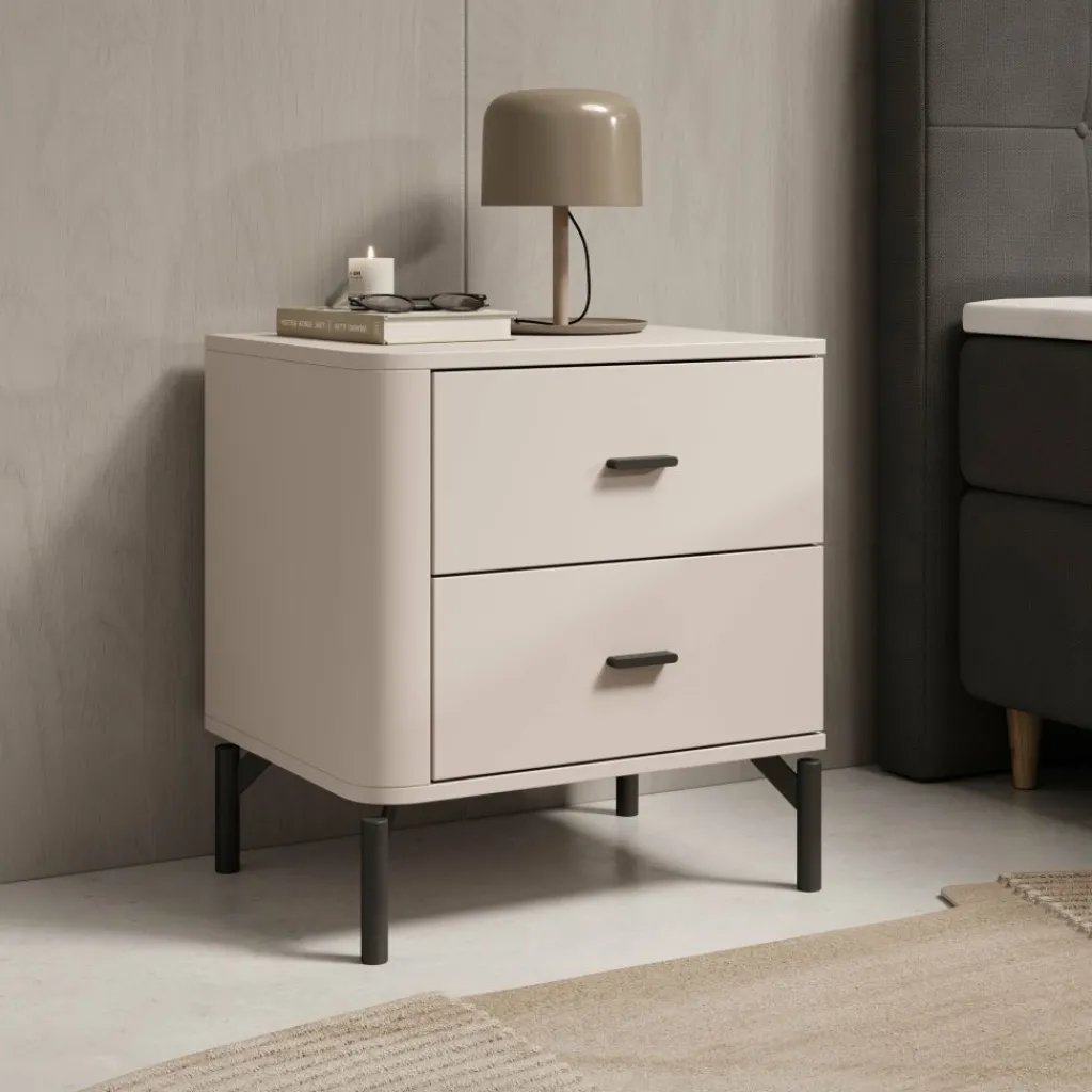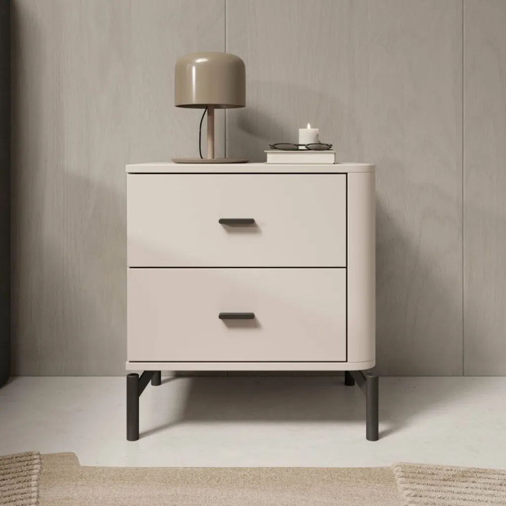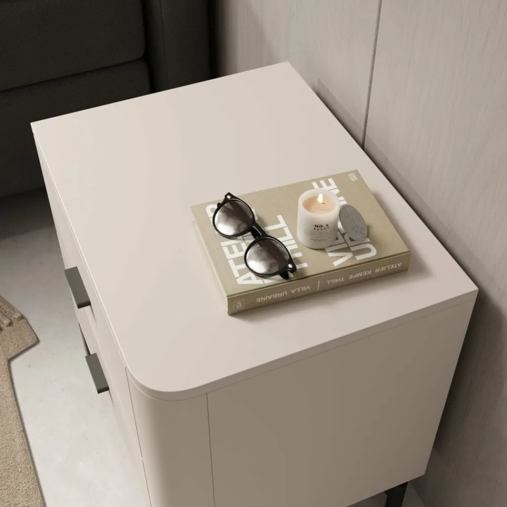 Het bovenblad biedt ruimte voor een lamp, wekker of decoratie. Sorello staat op slanke zwarte poten, wat zorgt voor een stabiele plaatsing en vrije ruimte onder het meubel. Dankzij de neutrale kleur en eenvoudige vormgeving is dit nachtkastje goed toepasbaar in verschillende slaapkamerindelingen.