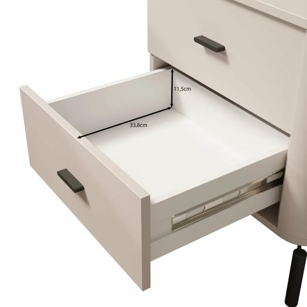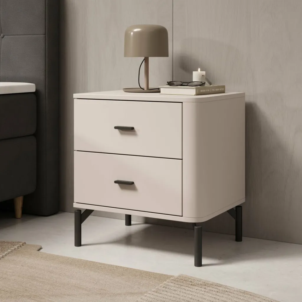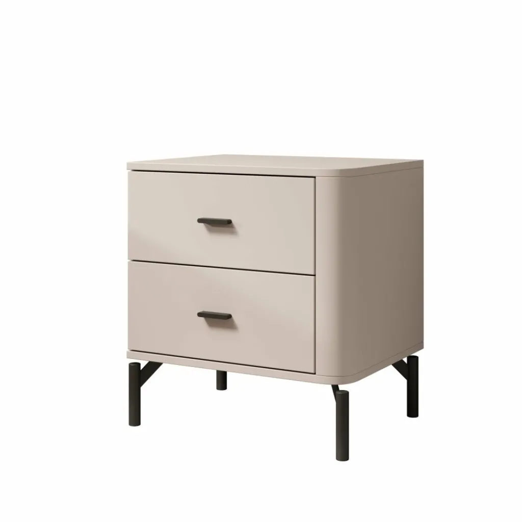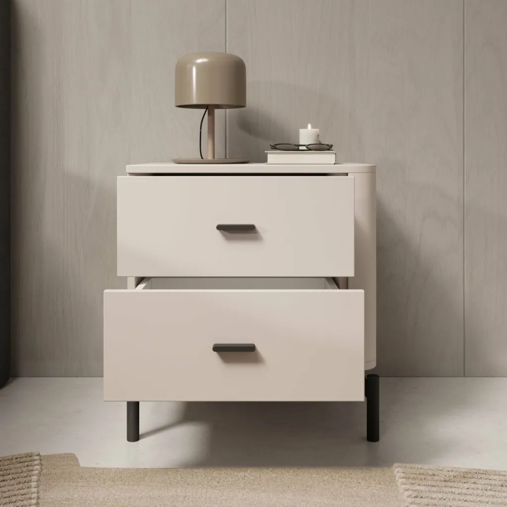 Het bovenblad biedt ruimte voor een lamp, wekker of decoratie. Sorello staat op slanke zwarte poten, wat zorgt voor een stabiele plaatsing en vrije ruimte onder het meubel. Dankzij de neutrale kleur en eenvoudige vormgeving is dit nachtkastje goed toepasbaar in verschillende slaapkamerindelingen.