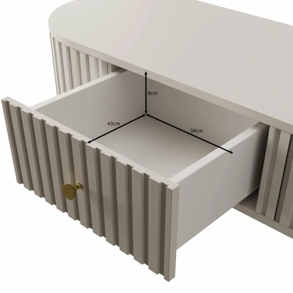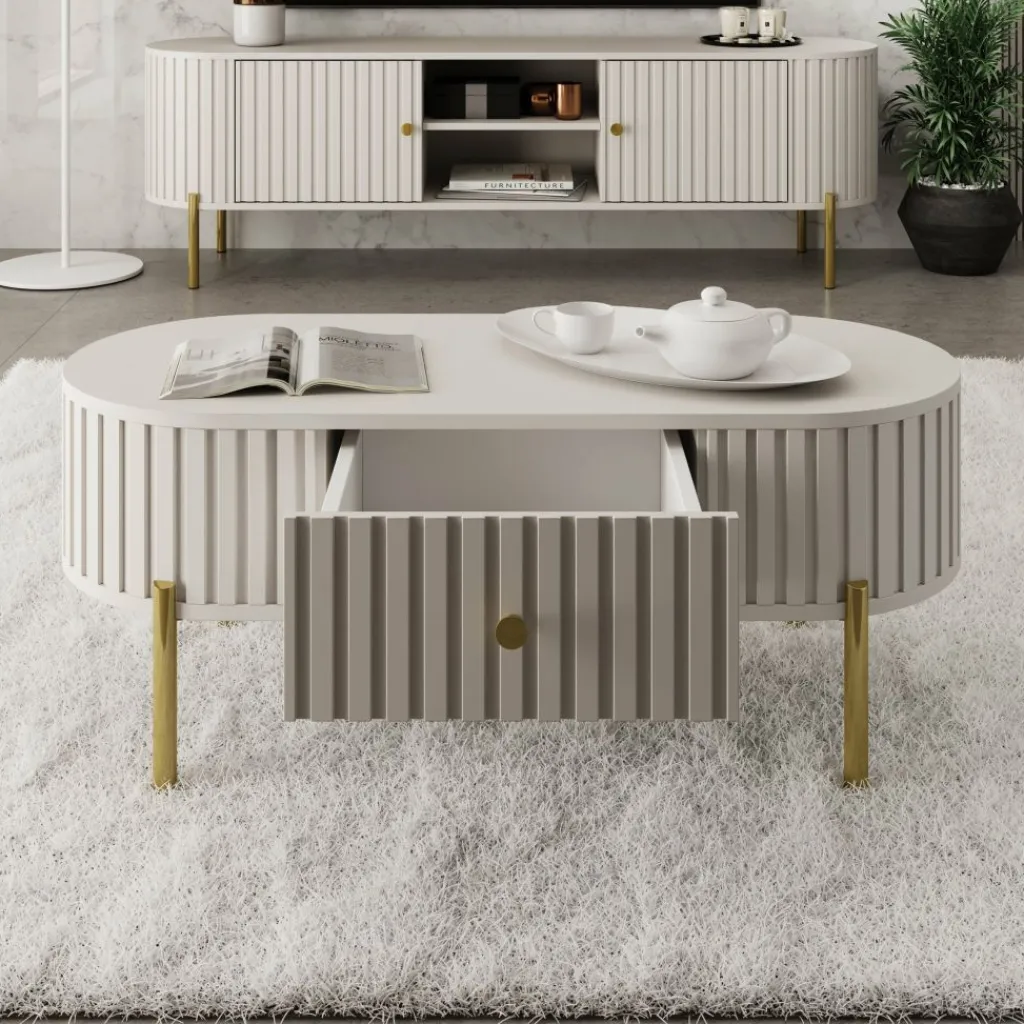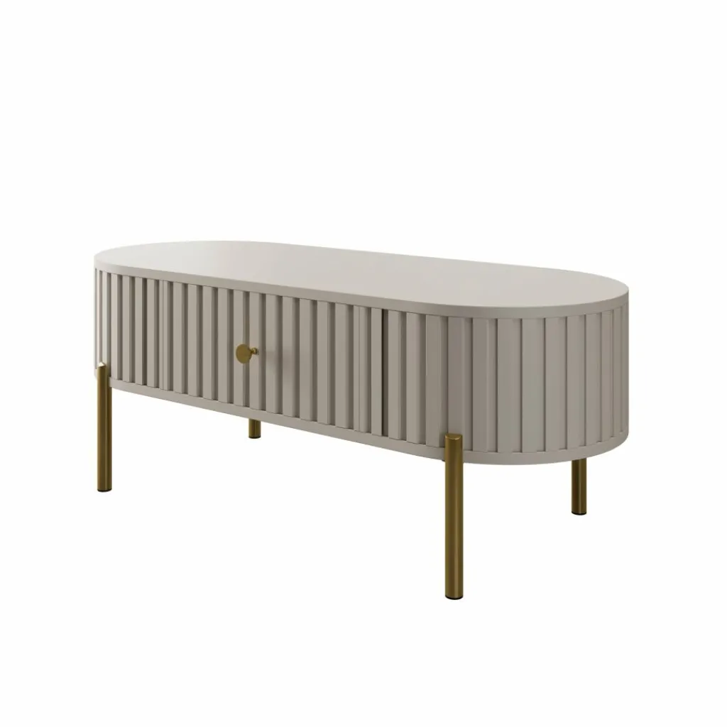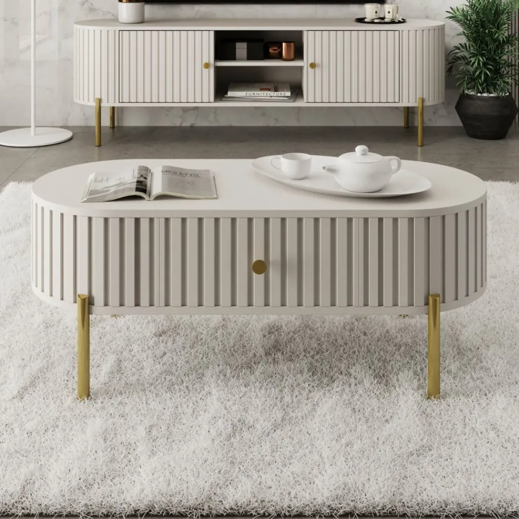 De Sorenna salontafel geeft je woonkamer een luxe uitstraling met zijn afgeronde vorm en verticale lijnstructuur. De beige kleur oogt rustig en past moeiteloos in zowel moderne als stijlvolle interieurs. De tafel staat op slanke goudkleurige metalen poten voor een chique accent.