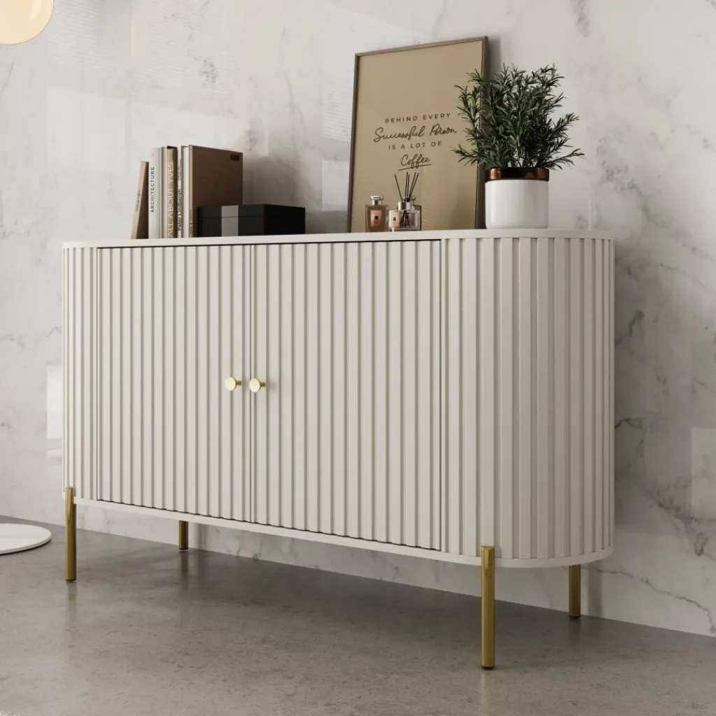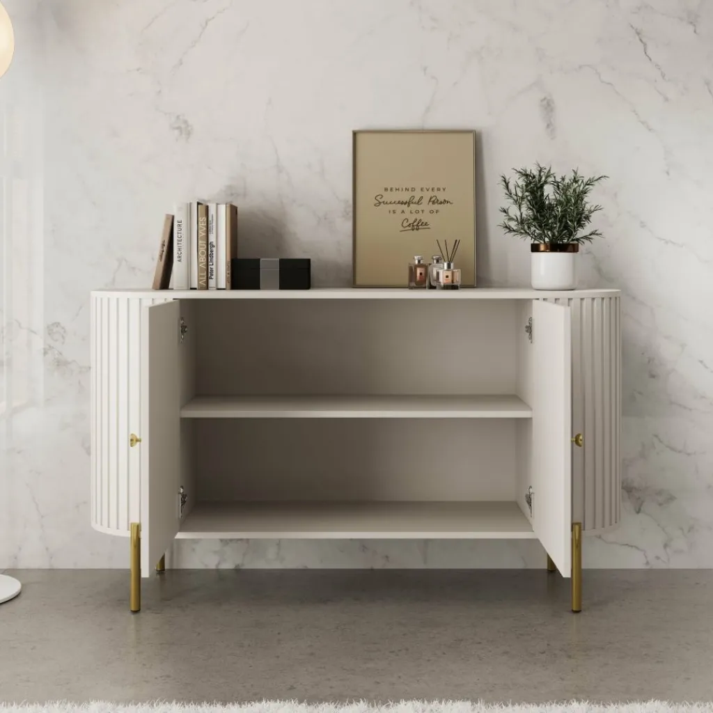 Het Sorenna dressoir in beige is een stijlvolle opberger met een luxe uitstraling. De verticale latstructuur aan de voorzijde geeft het meubel karakter, terwijl de slanke goudkleurige poten zorgen voor een moderne afwerking. Dankzij de twee draaideuren met ronde greep open je het dressoir eenvoudig en heb je direct toegang tot de ruime opbergvakken met tussenplank. Handig voor servies, glaswerk, papieren en andere items die je graag uit het zicht bewaart.