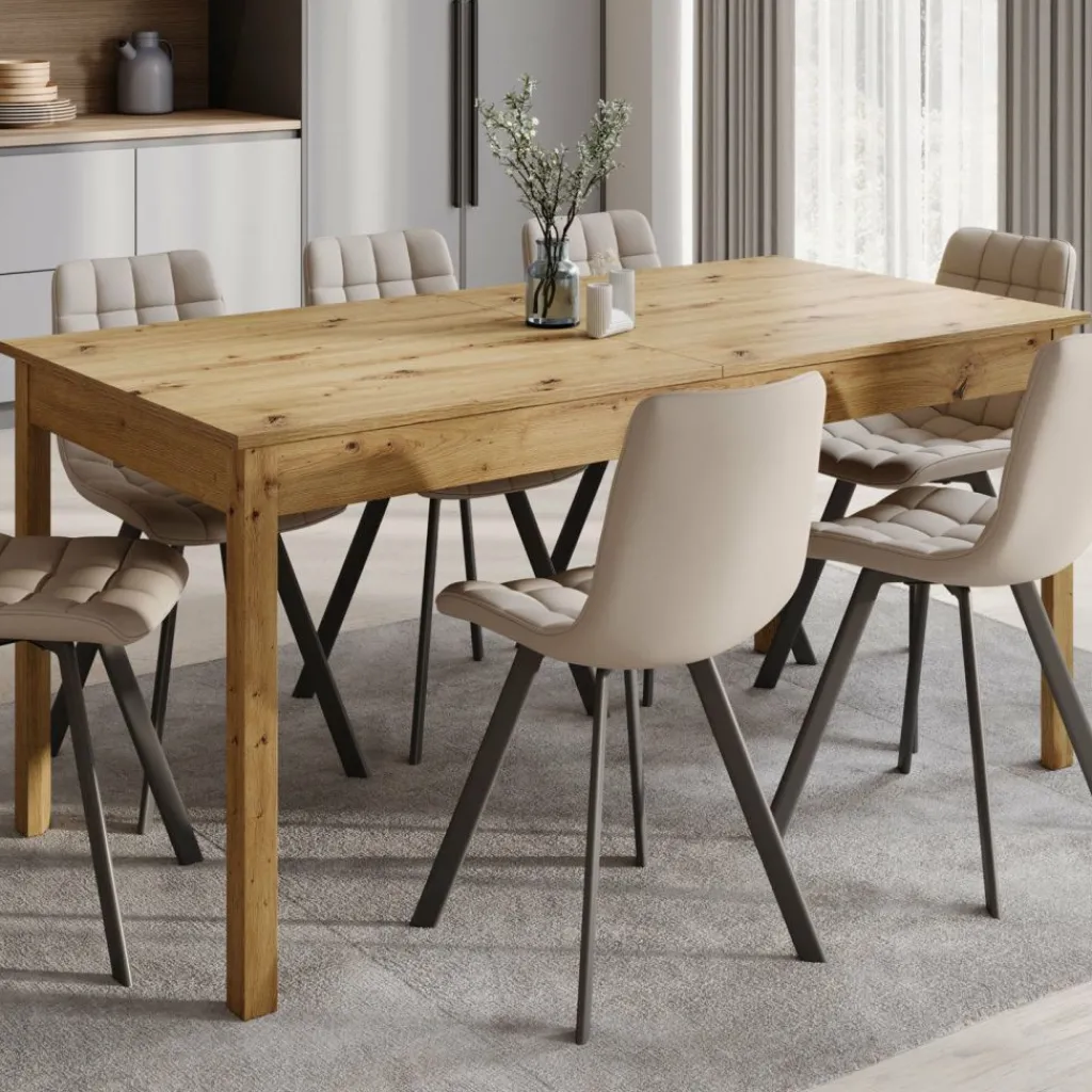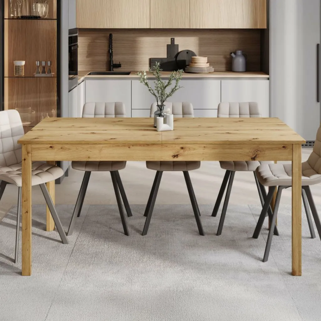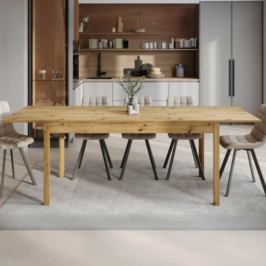 De eetkamertafel Steve is een rechthoekige eettafel die volledig uitgevoerd is in de kleur eiken. De Steve is uitschuifbaar van 160 cm naar 230 cm. Ook kan je de tussenmaat van 195 cm toepassen. De tafel is geschikt voor 6 tot 8 personen. Het meubel heeft een moderne uitstraling.