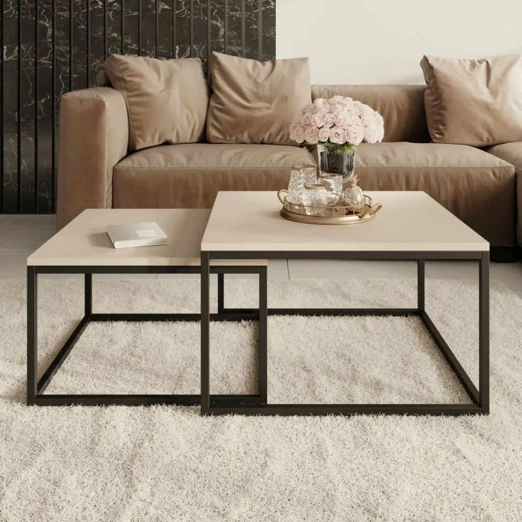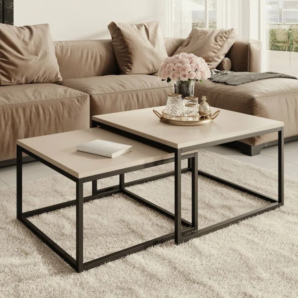 Salontafel Styler is een set van 2 vierkante salontafels in matchend design. De set bestaat uit 2 salontafels in verschillende formaten die gemakkelijk in elkaar kunnen worden geschoven wanneer er ruimte gemaakt moet worden. De Styler heeft een beige bovenblad en staat op een stevig zwart metalen frame, wat zorgt voor een moderne en stijlvolle uitstraling.