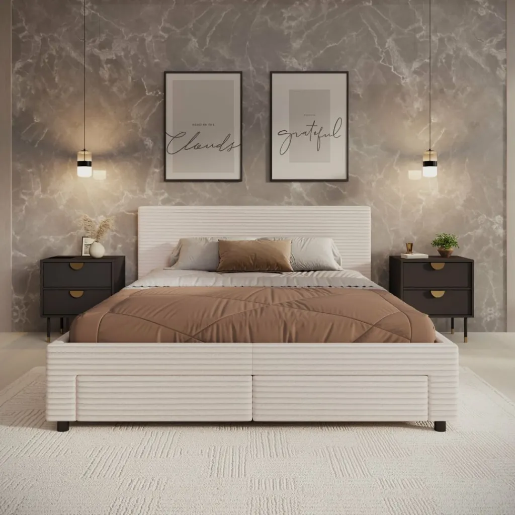 Het Suente bed van 160×200 cm biedt de perfecte balans tussen comfort en functionaliteit. Bekleed met zachte ribstof in een stijlvolle beige tint, zorgt dit bed voor een moderne en sfeervolle uitstraling in de slaapkamer. Onder het bed bevinden zich 4 ruime lades waarin je eenvoudig beddengoed, kussens of accessoires opbergt. Dankzij het formaat is dit bed uitermate geschikt voor stellen die van een wat compacter tweepersoonsbed houden.