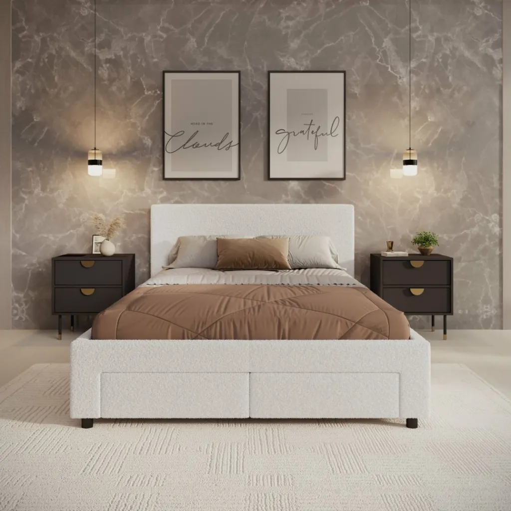 Het Suente tweepersoonsbed van 140×200 cm is een stijlvolle en praktische toevoeging aan iedere slaapkamer. Bekleed met zachte teddystof in een warme witte kleur, brengt dit bed direct een knusse en moderne uitstraling in de ruimte. Het verticale lijnpatroon in het hoofdbord geeft het geheel een elegante touch.