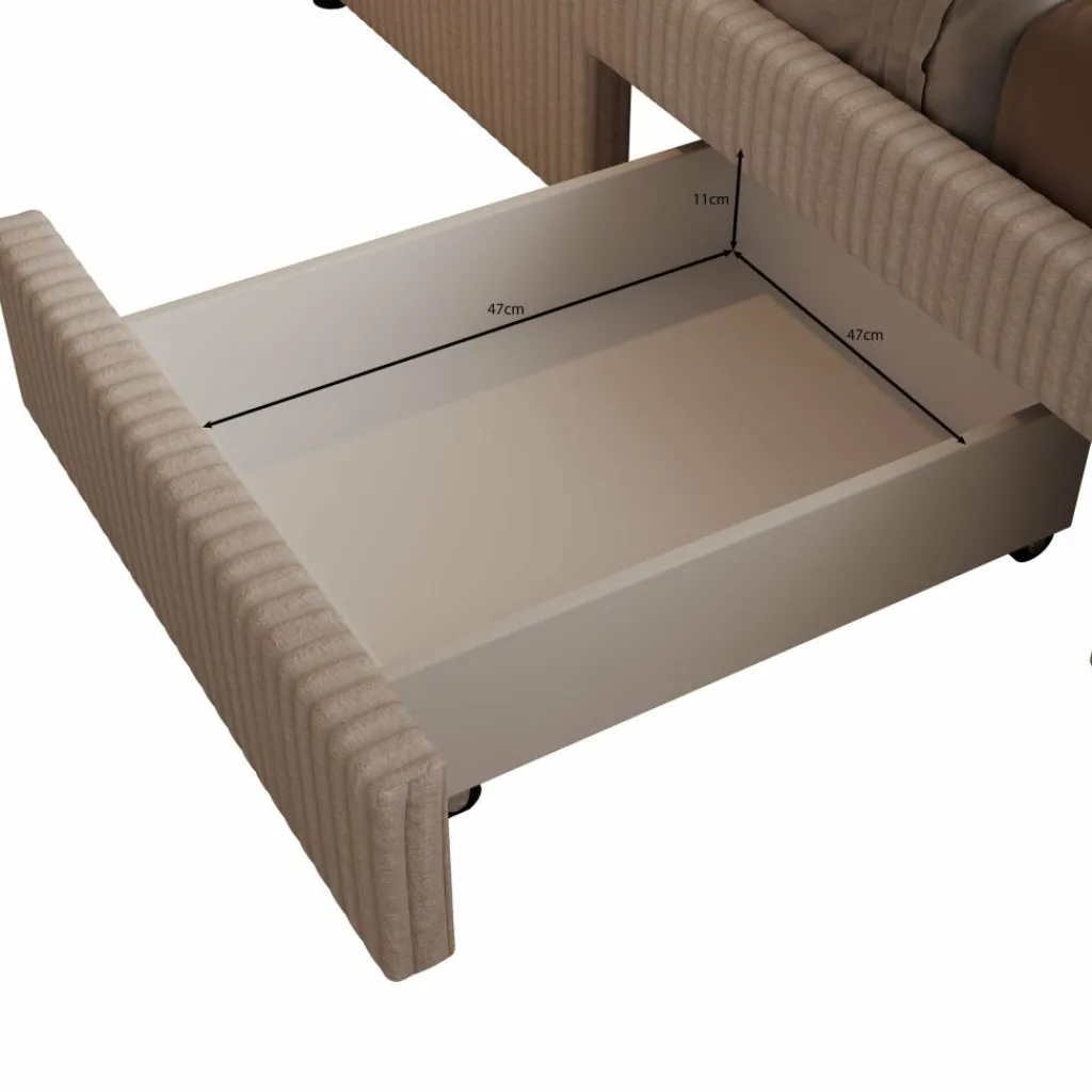 Onder het bed bevinden zich 4 praktische lades waarin je gemakkelijk dekens, kleding of accessoires kunt opbergen. Dit maakt het Suente bed niet alleen comfortabel om in te slapen, maar ook bijzonder functioneel. De maat van 160×200 cm biedt voldoende ruimte voor twee personen, perfect voor wie graag iets compacter slaapt zonder comfort te verliezen.
