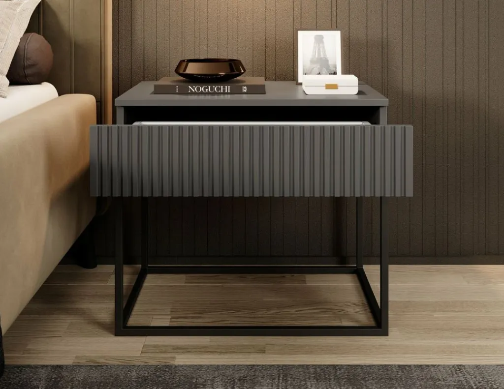 Nachtkastje Sylvester is een opbergkastje voor naast het bed. De Sylvester beschikt over 1 lade die opent met het push to open systeem. De voorkant van de lade heeft een lattenpatroon. Het nachtkastje staat op een zwart onderstel dat gemaakt is van metaal.
