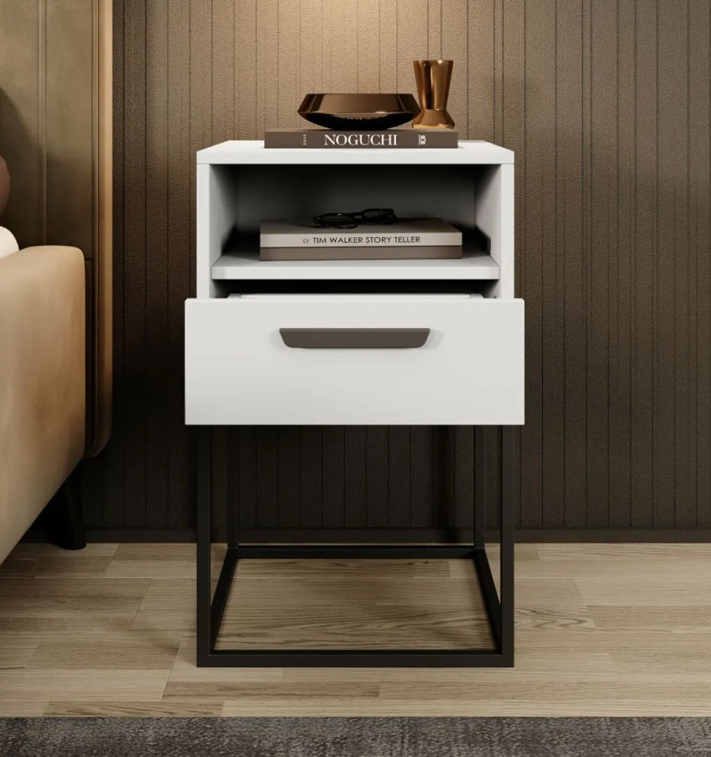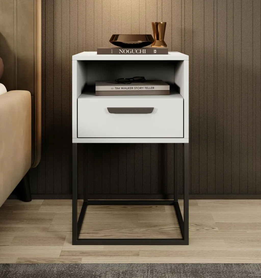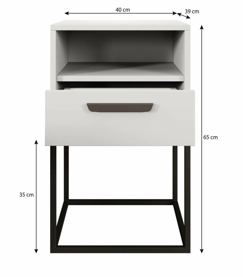 Nachtkastje Sylvester is een opbergkastje voor naast het bed. De Sylvester beschikt over 1 lade die opent met een zwarte handgreep. Daarboven is nog een open vak geplaatst. Het nachtkastje staat op een zwart onderstel dat gemaakt is van metaal.
