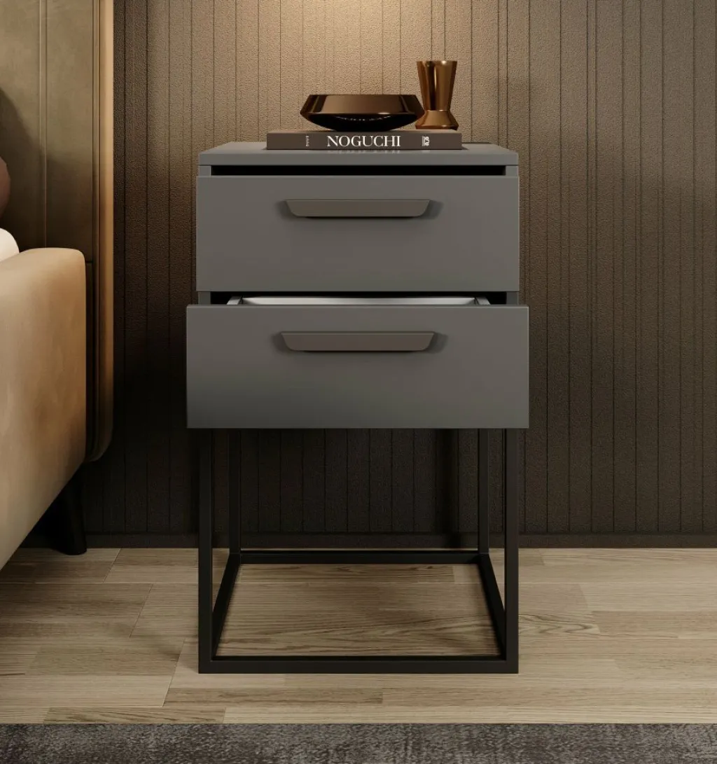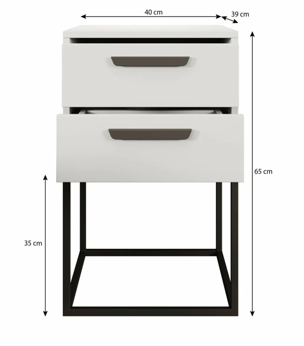 Nachtkastje Sylvester is een opbergkastje voor naast het bed. De Sylvester beschikt over 2 lades die openen met zwarte handgrepen. Het nachtkastje staat op een zwart onderstel dat gemaakt is van metaal.