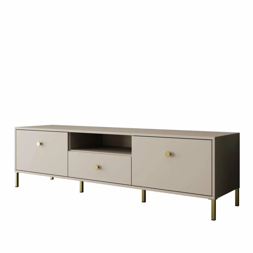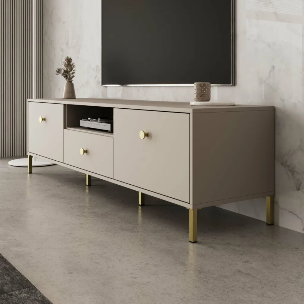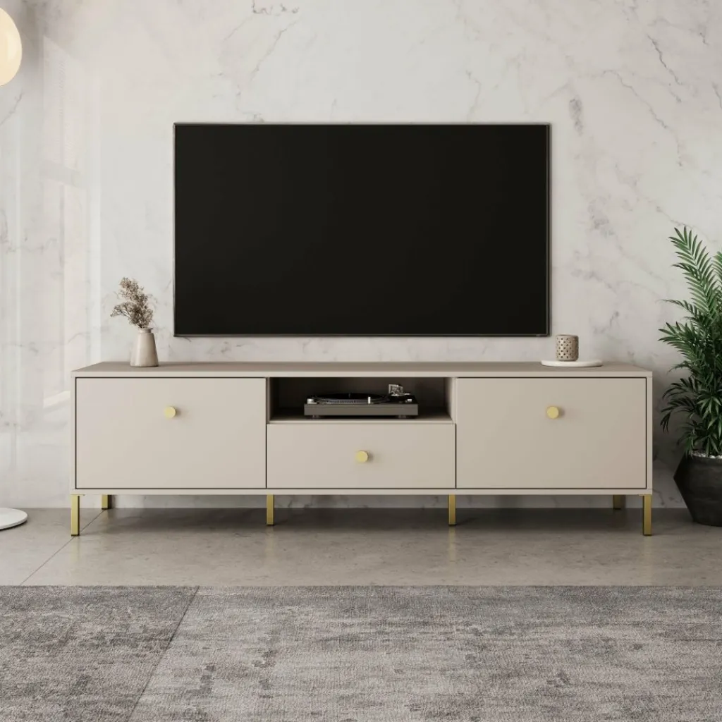 Syran staat op slanke metalen poten in goudkleur, wat zorgt voor een stabiele plaatsing en extra ruimte onder het meubel. De ronde goudkleurige knoppen sluiten hier netjes op aan. De beige afwerking maakt het tv-meubel eenvoudig te combineren met andere meubels uit de Syran serie.