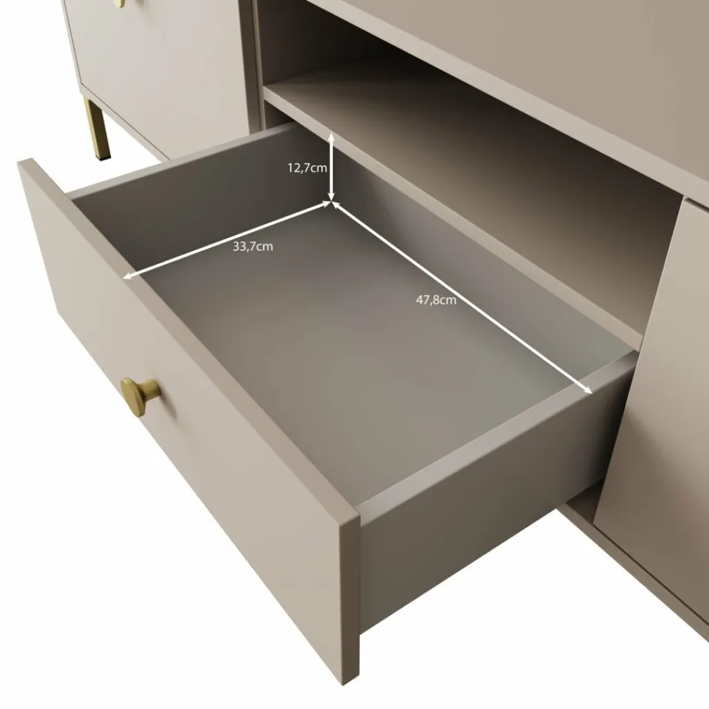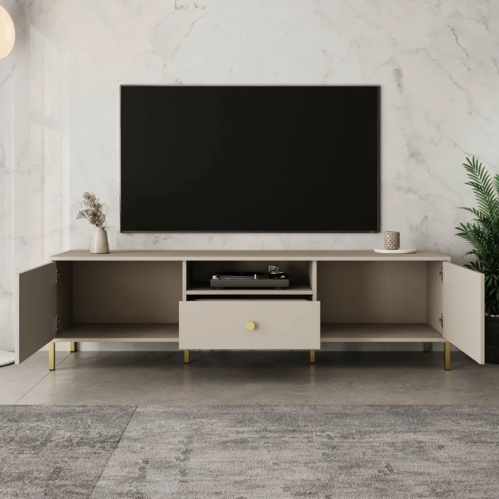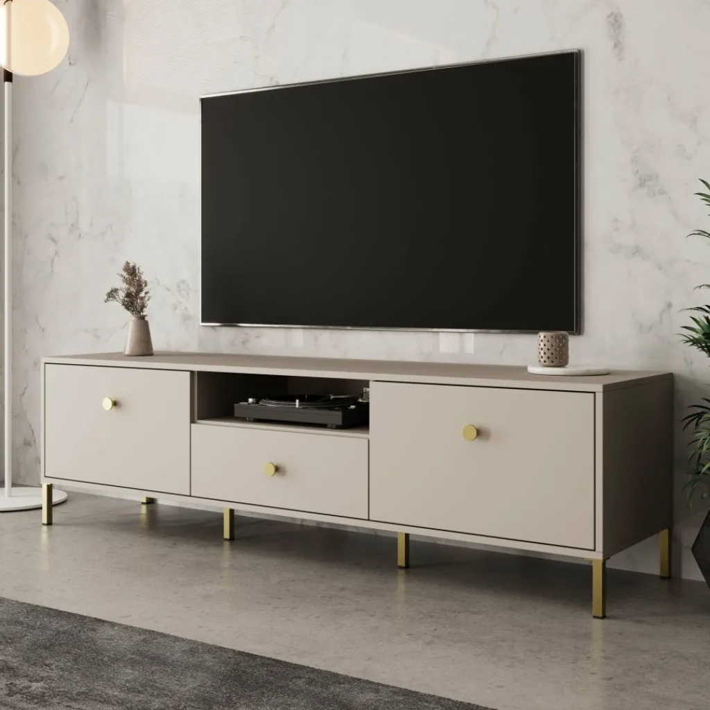 Syran staat op slanke metalen poten in goudkleur, wat zorgt voor een stabiele plaatsing en extra ruimte onder het meubel. De ronde goudkleurige knoppen sluiten hier netjes op aan. De beige afwerking maakt het tv-meubel eenvoudig te combineren met andere meubels uit de Syran serie.