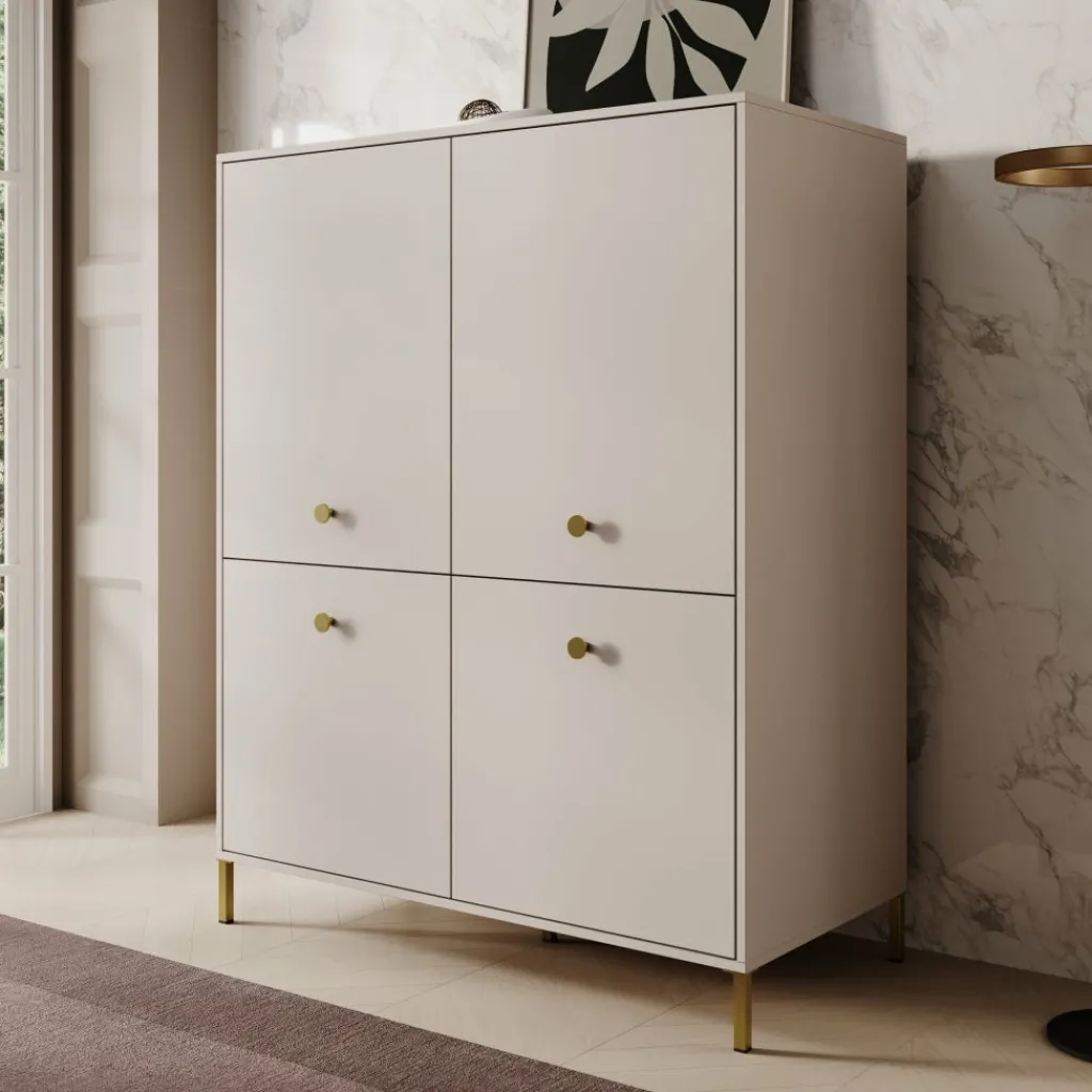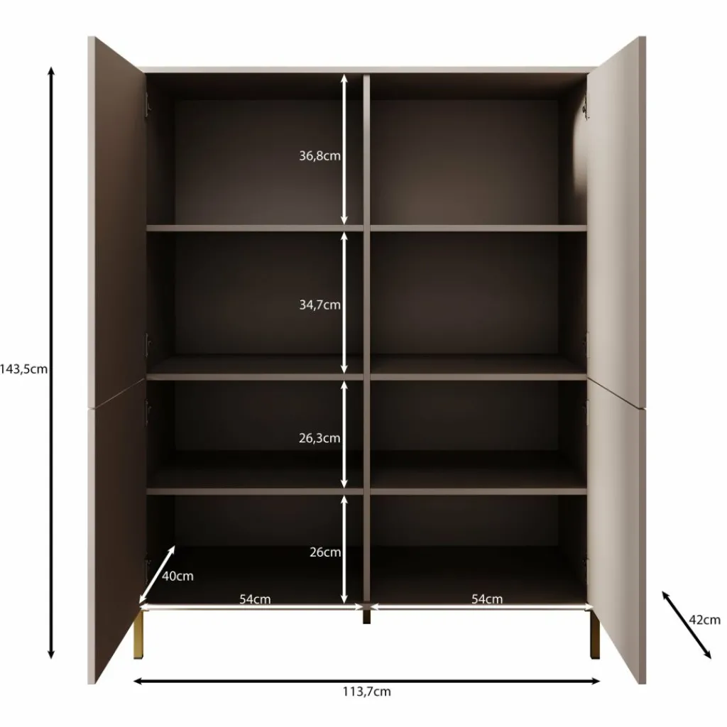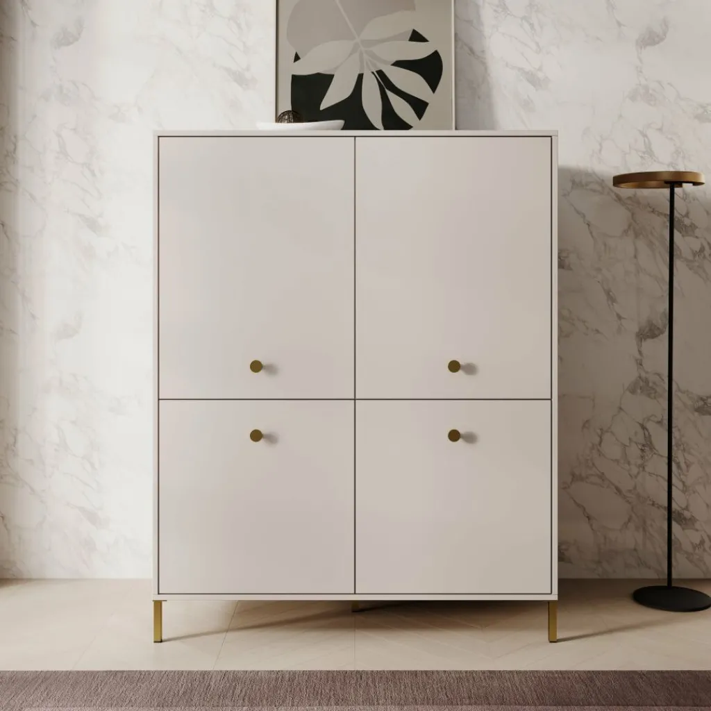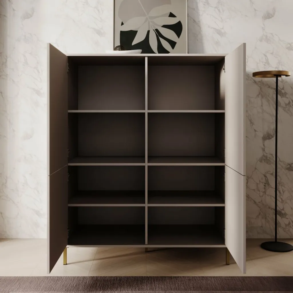 Het dressoir is uitgevoerd met vier deuren, elk voorzien van een ronde goudkleurige knop. Achter de deuren bevindt zich een indeling met meerdere vaste legplanken, waardoor er in totaal acht vakken ontstaan. Deze indeling maakt het eenvoudig om servies, woonaccessoires, administratie of andere spullen overzichtelijk op te bergen.