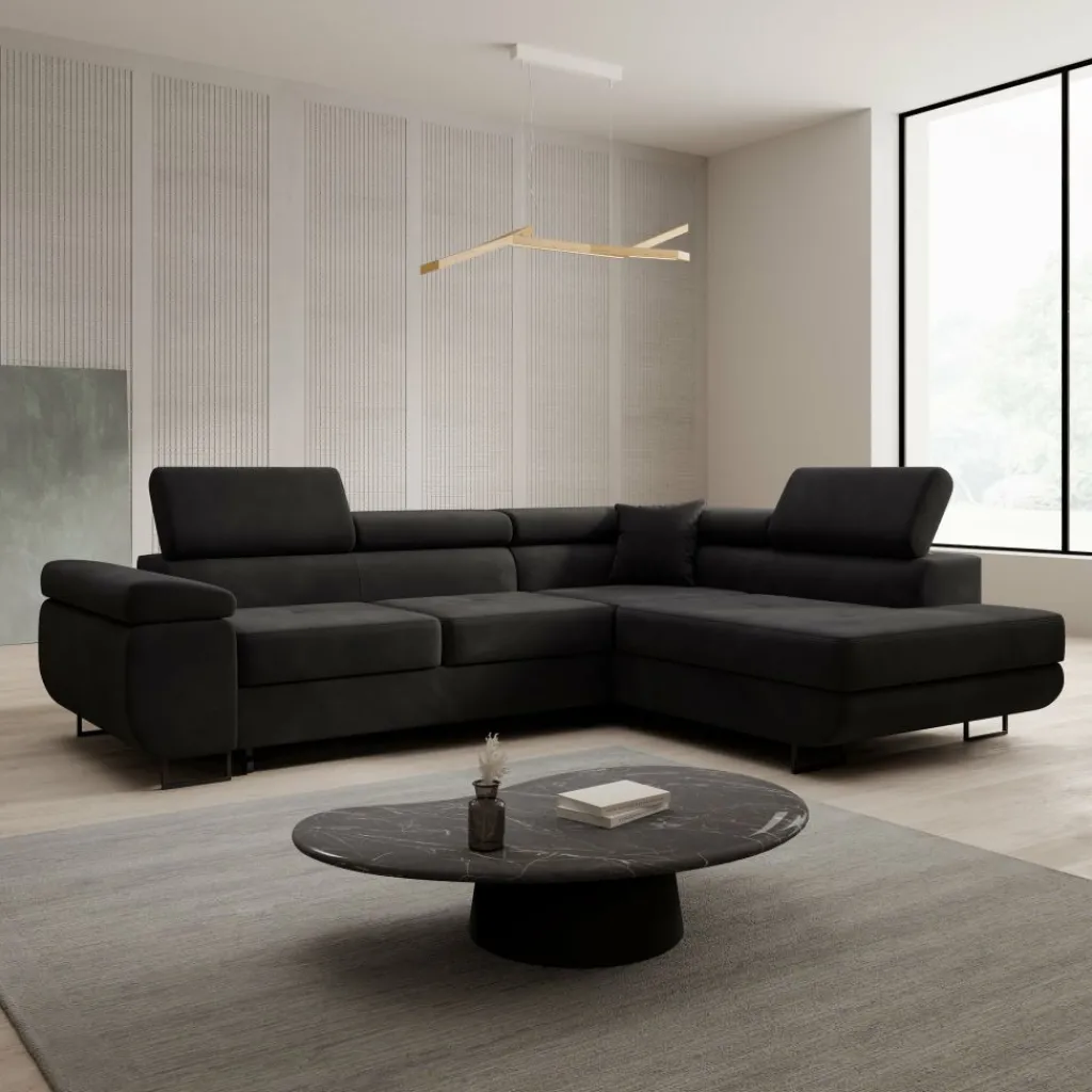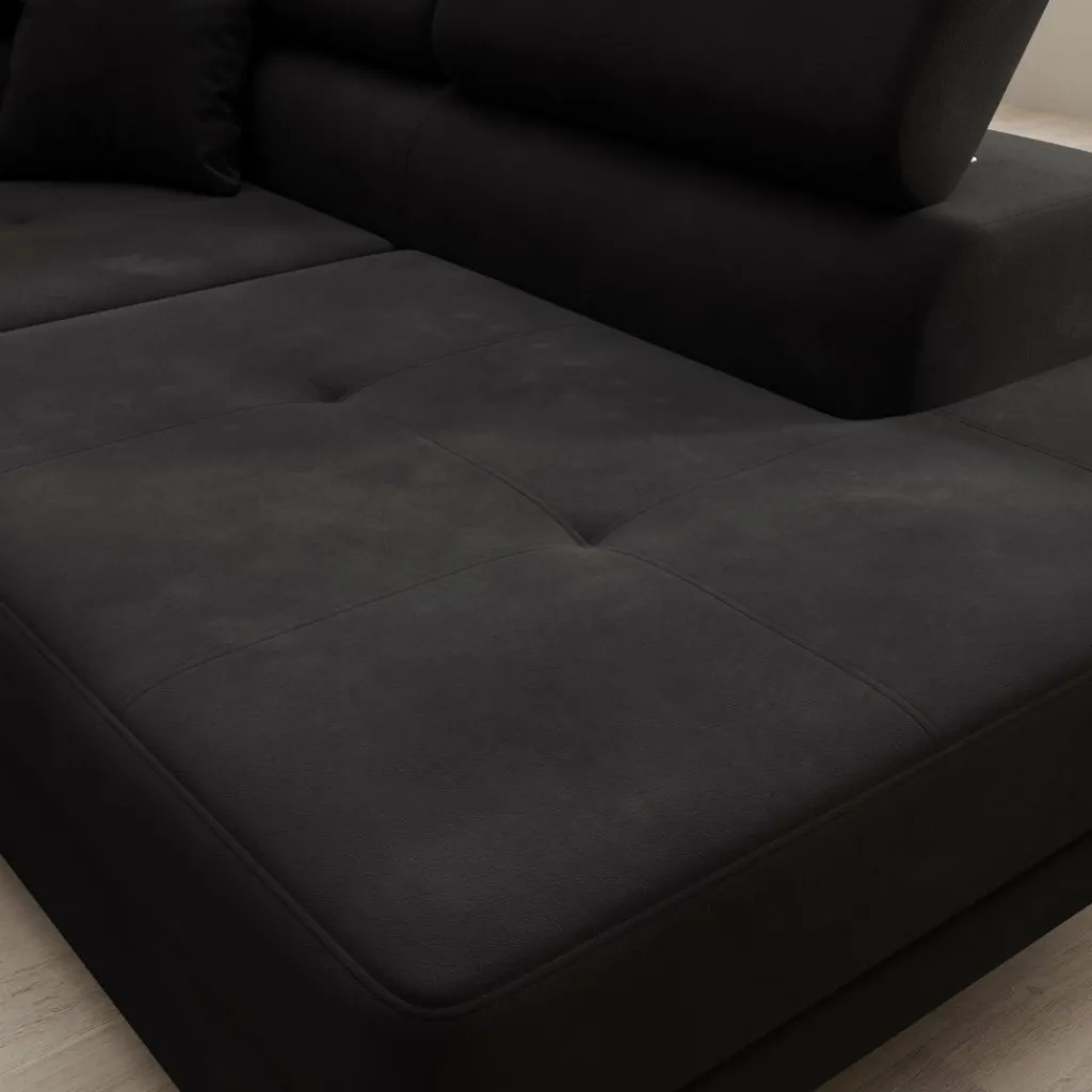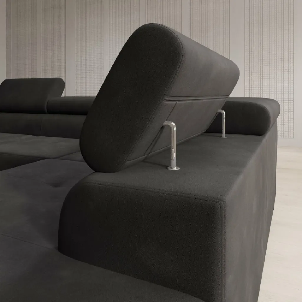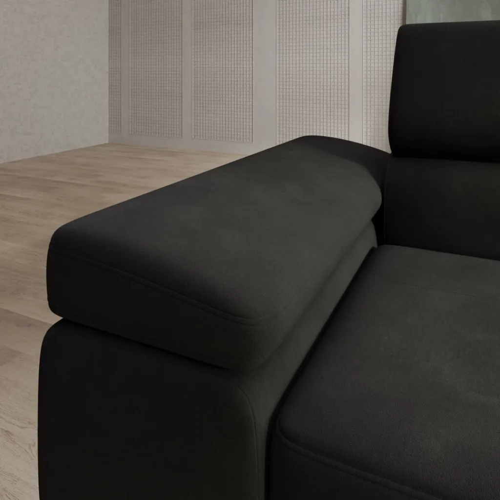 De bekleding is uitgevoerd in zwart velvet en heeft een egale, diepe kleur met een subtiele glans. De brede zitkussens en lage ruglijn vormen één strak geheel. De verstelbare hoofdsteunen maken het mogelijk om de rughoogte per zitplaats aan te passen. De chaise longue biedt extra ligruimte en maakt ontspannen zitten of languit liggen mogelijk.