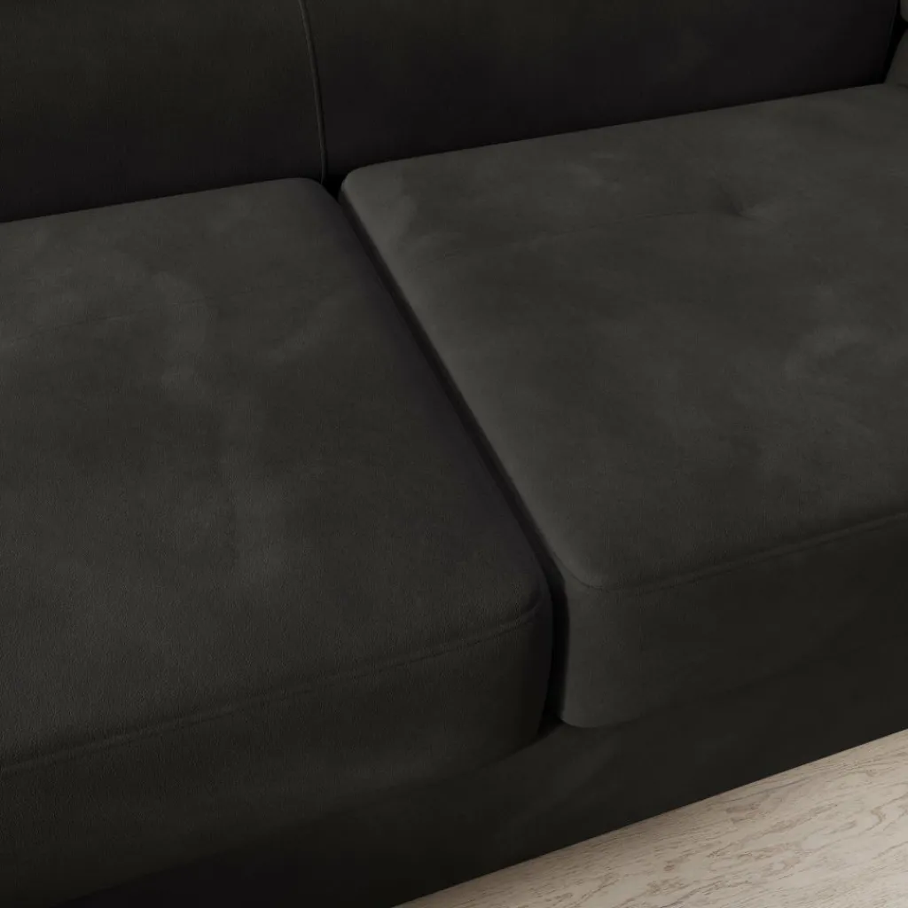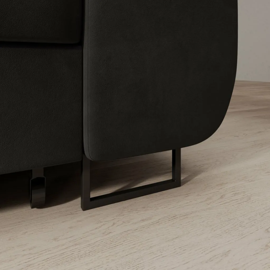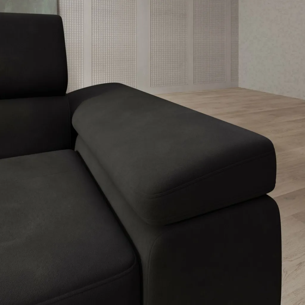 De bekleding is uitgevoerd in zwart velvet, wat zorgt voor een egale, diepe kleur met een subtiele glans. De brede zitkussens en lage ruglijn geven de bank een strak geheel. De verstelbare hoofdsteunen maken het mogelijk om de rughoogte aan te passen per zitplaats. De chaise longue biedt extra ligruimte en maakt ontspannen zitten of languit liggen mogelijk.