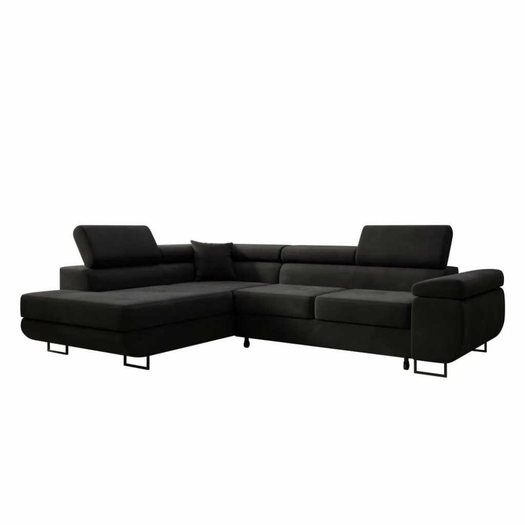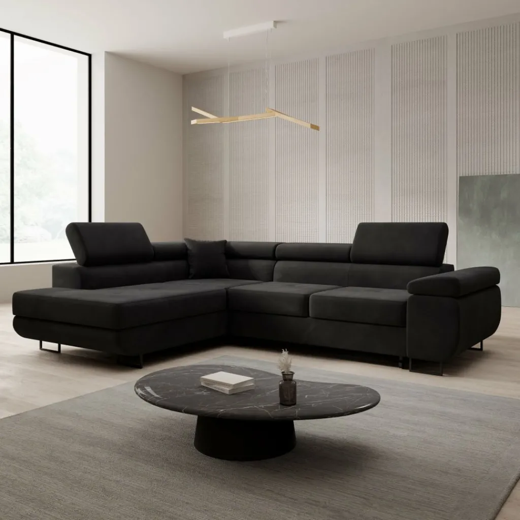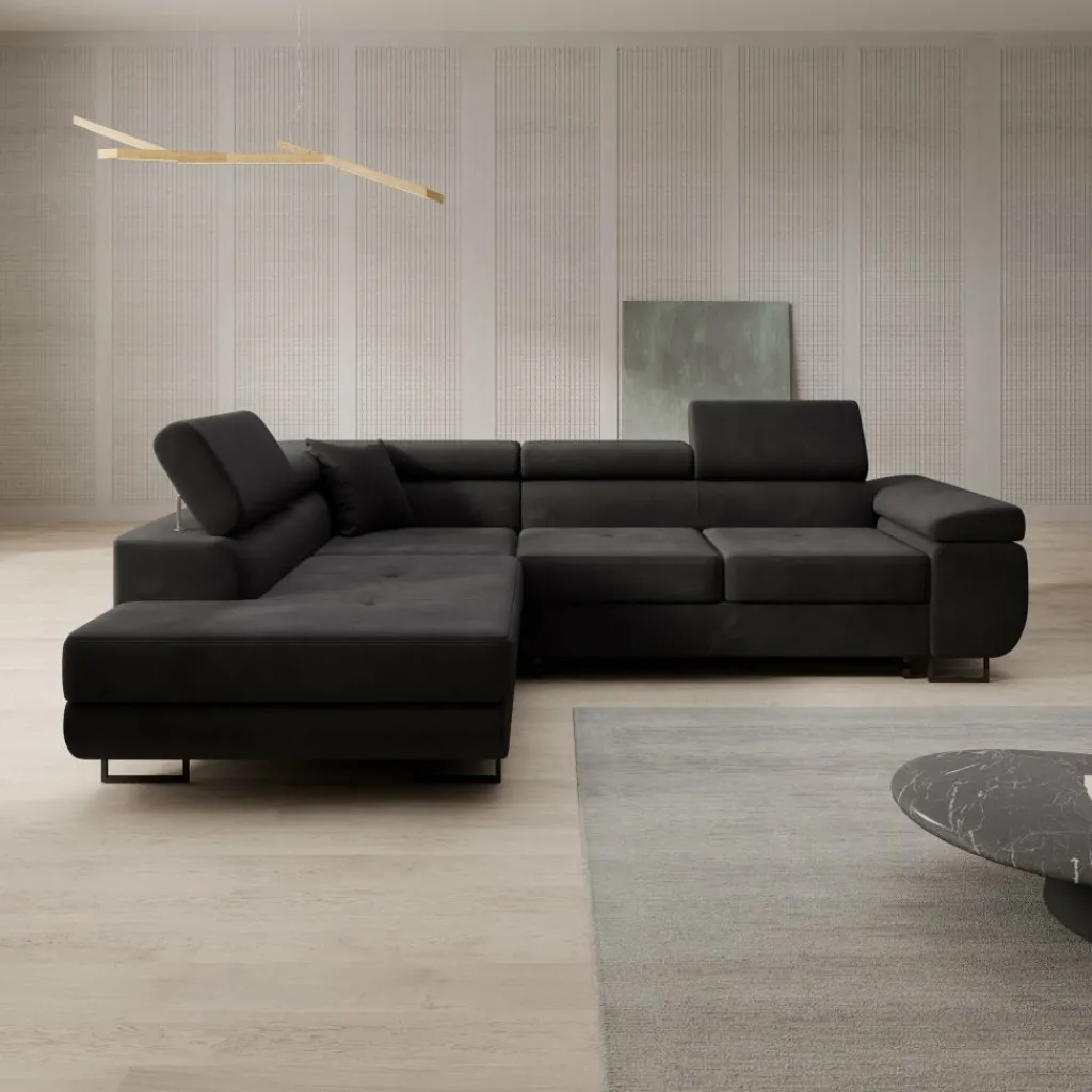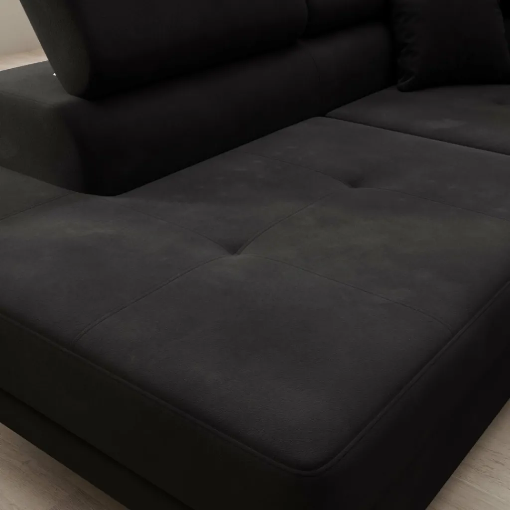De bekleding is uitgevoerd in zwart velvet, wat zorgt voor een egale, diepe kleur met een subtiele glans. De brede zitkussens en lage ruglijn geven de bank een strak geheel. De verstelbare hoofdsteunen maken het mogelijk om de rughoogte aan te passen per zitplaats. De chaise longue biedt extra ligruimte en maakt ontspannen zitten of languit liggen mogelijk.