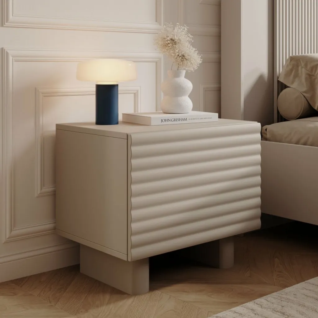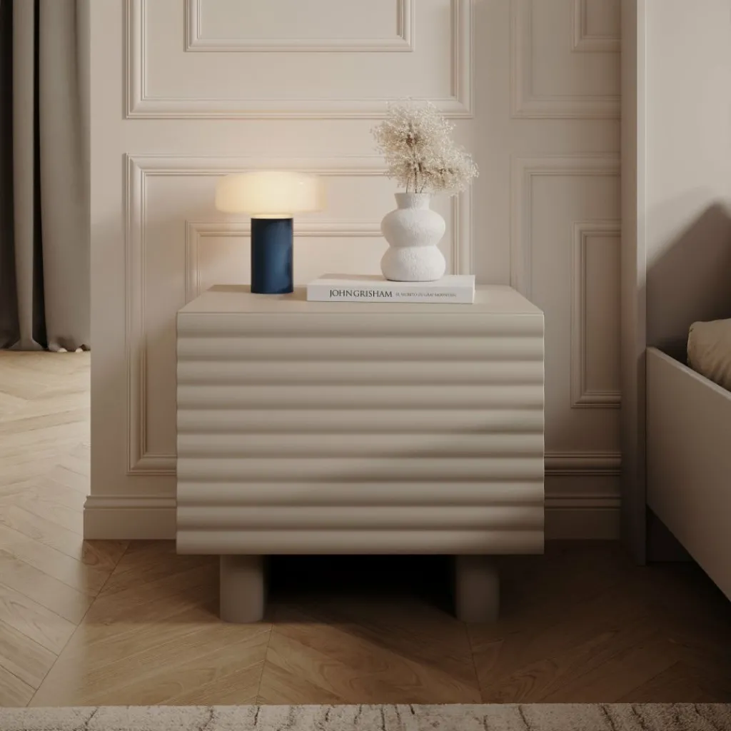 De matte beige afwerking zorgt voor een rustige en uniforme uitstraling. Het kastje staat op brede, lage poten die het geheel stabiliteit geven en het ontwerp een modern karakter meegeven. Het bovenblad biedt voldoende ruimte voor een lamp, wekker of accessoires.