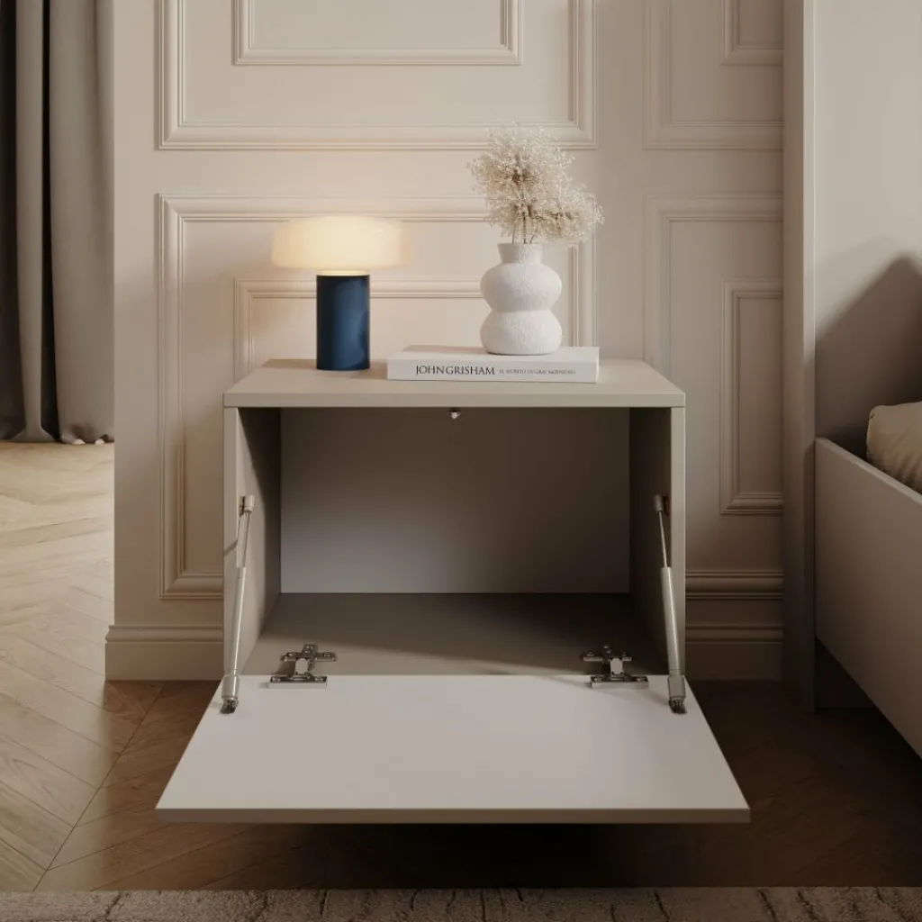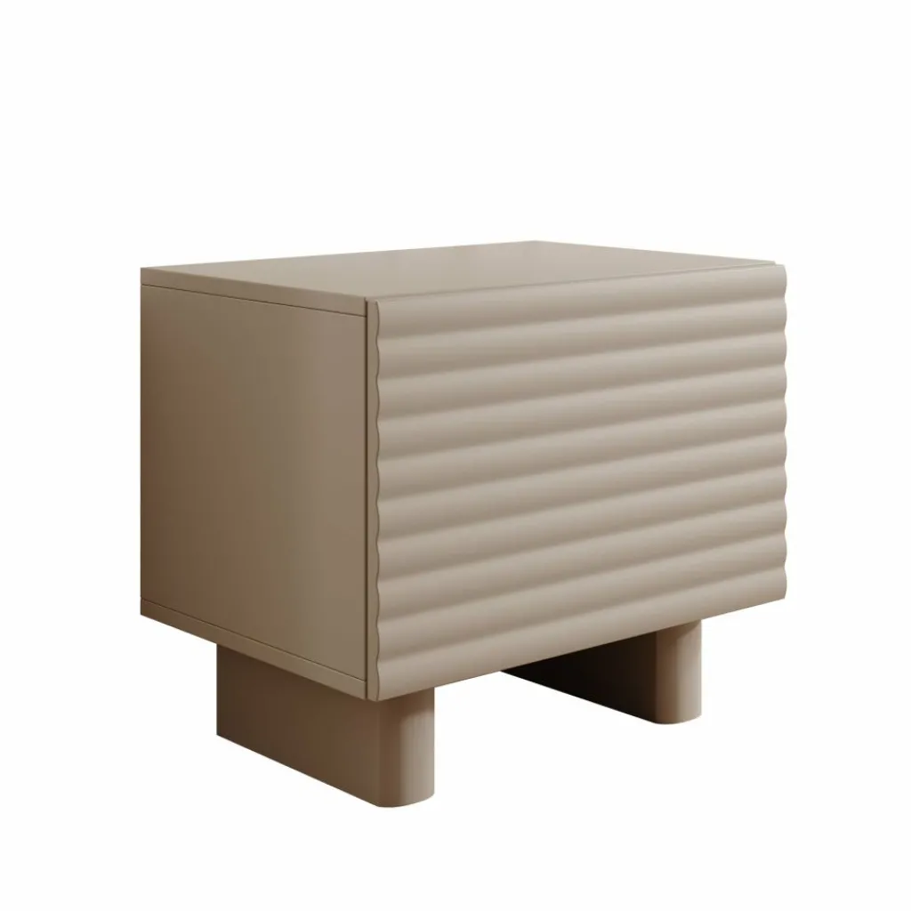 Het Tactica nachtkastje in beige heeft een strak ontwerp met een klepdeur die is afgewerkt met een horizontaal golvend reliëf. Dankzij het formaat van 50×37 cm en de hoogte van 46 cm past het kastje goed naast de meeste bedden. Achter de klep bevindt zich een ruime opbergruimte voor boeken, opladers of andere items die je binnen handbereik wilt houden.