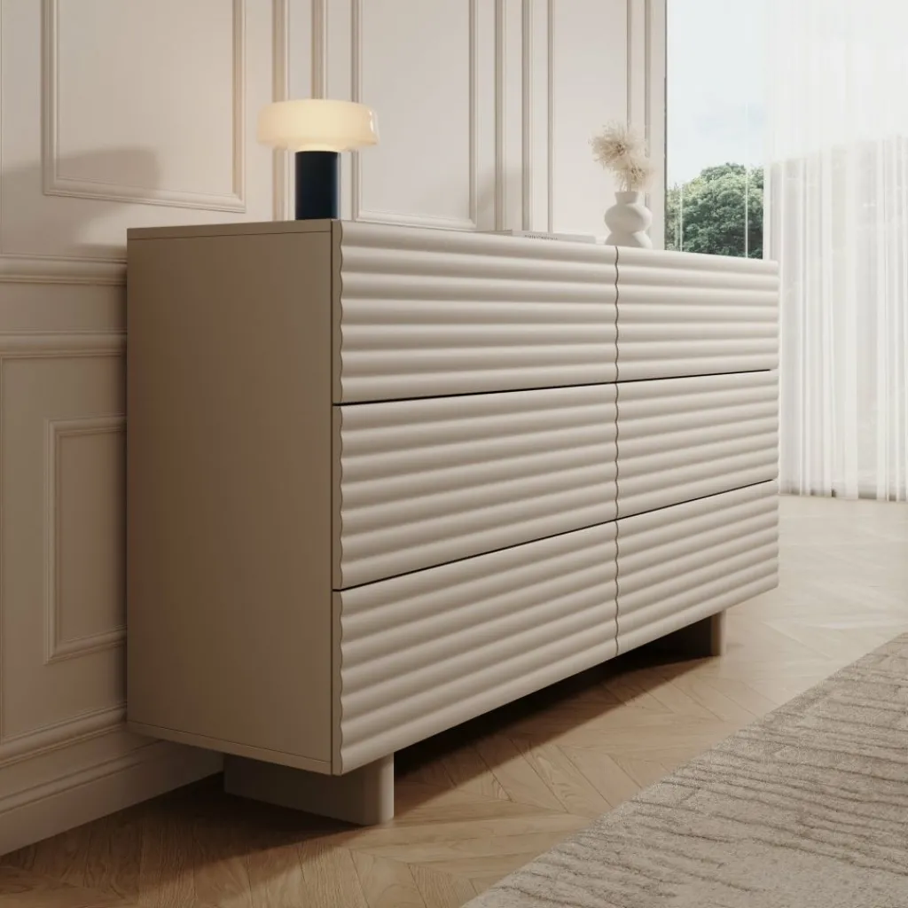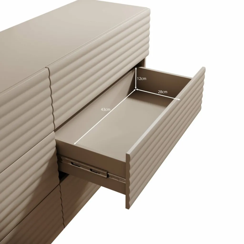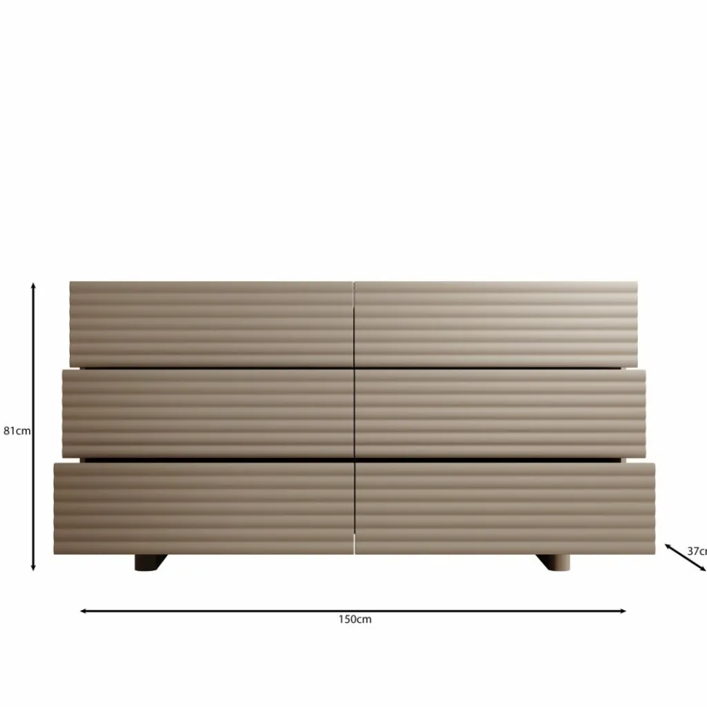 Het Tactica dressoir in beige heeft een strak ontwerp met horizontale golvende fronten die het meubel een modern karakter geven. De kast is 150 cm breed en beschikt over zes ruime laden die soepel openen en sluiten. Deze indeling biedt voldoende opbergcapaciteit voor bijvoorbeeld servies, textiel of andere dagelijkse items.