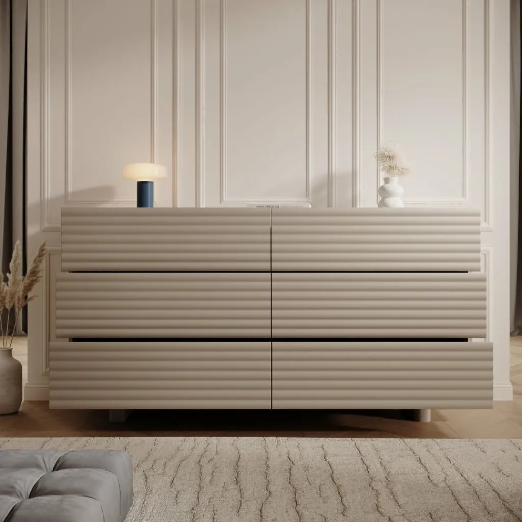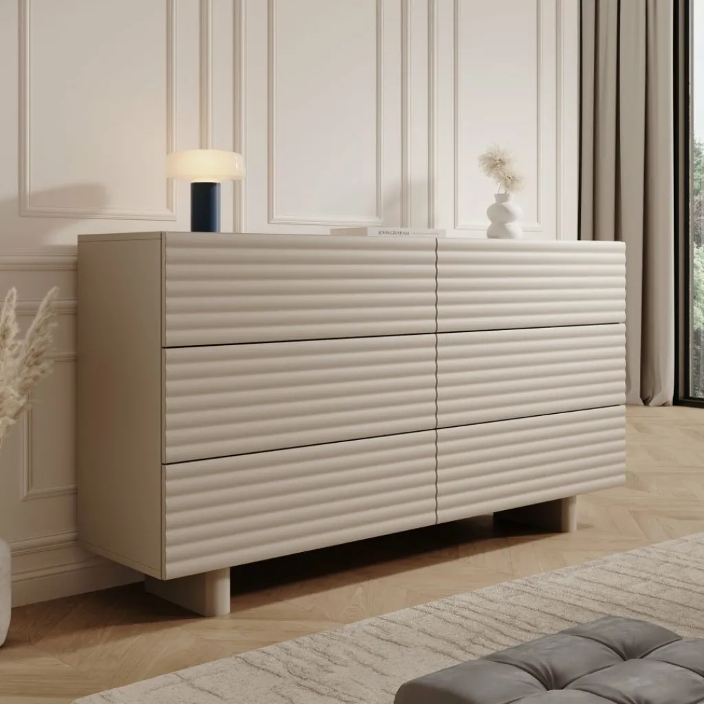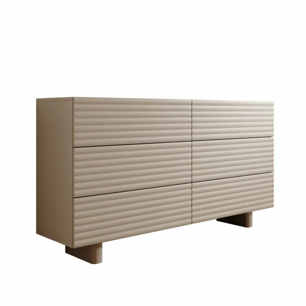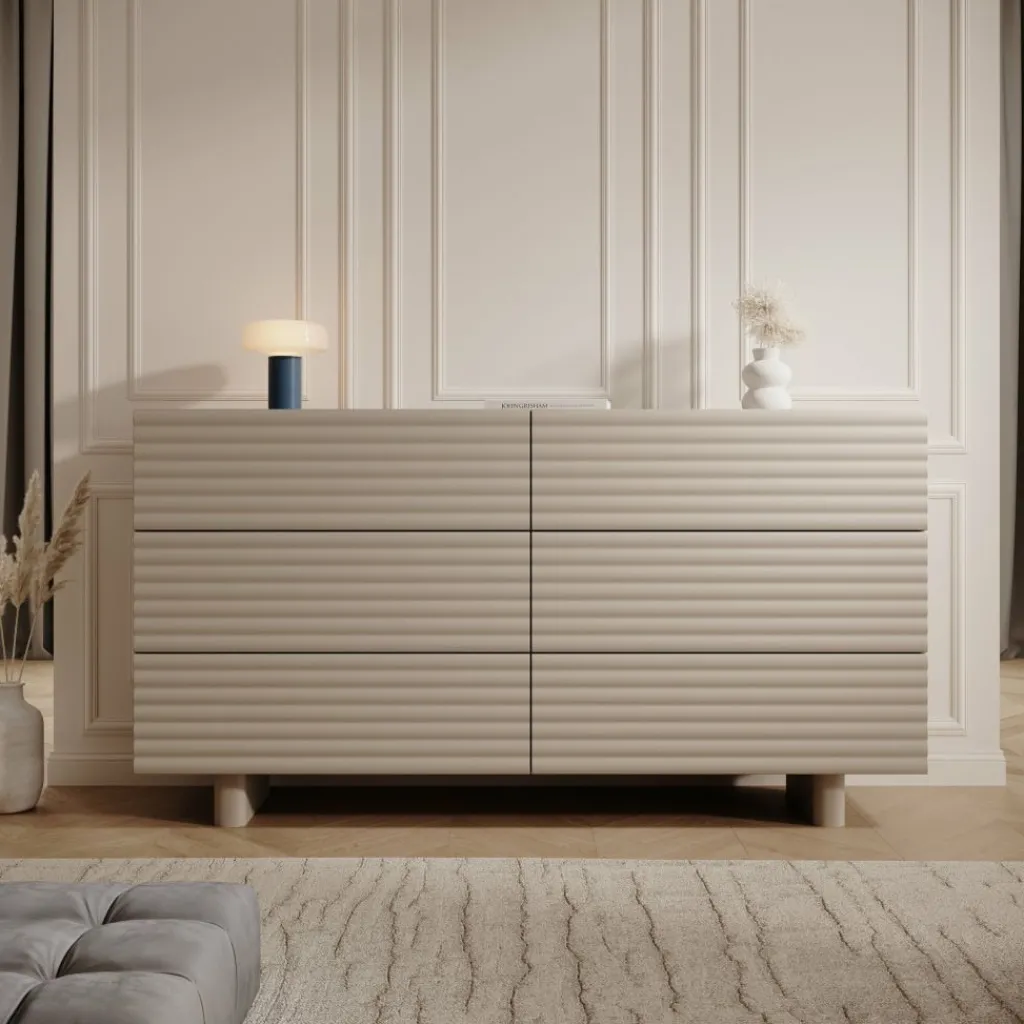 Het Tactica dressoir in beige heeft een strak ontwerp met horizontale golvende fronten die het meubel een modern karakter geven. De kast is 150 cm breed en beschikt over zes ruime laden die soepel openen en sluiten. Deze indeling biedt voldoende opbergcapaciteit voor bijvoorbeeld servies, textiel of andere dagelijkse items.