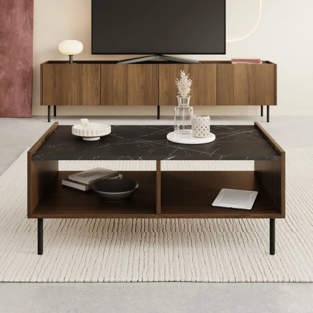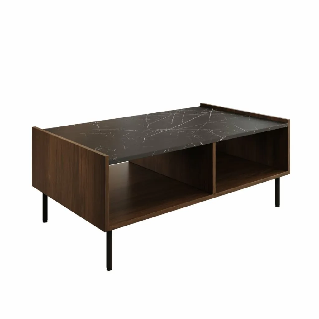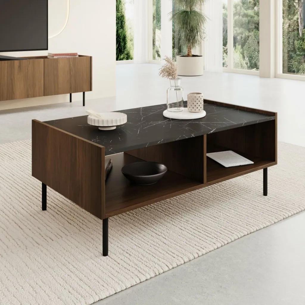 De salontafel Tahiti in donker eikenlook heeft een strak ontwerp met een duidelijke materiaalcombinatie. De donkere houtlook in combinatie met het zwarte marmerlook blad geeft de tafel een moderne en verzorgde uitstraling.