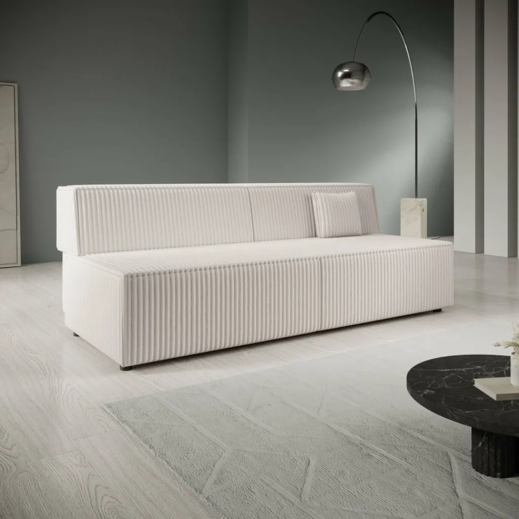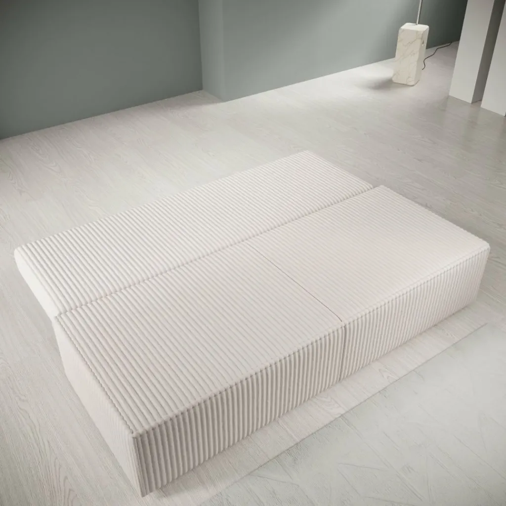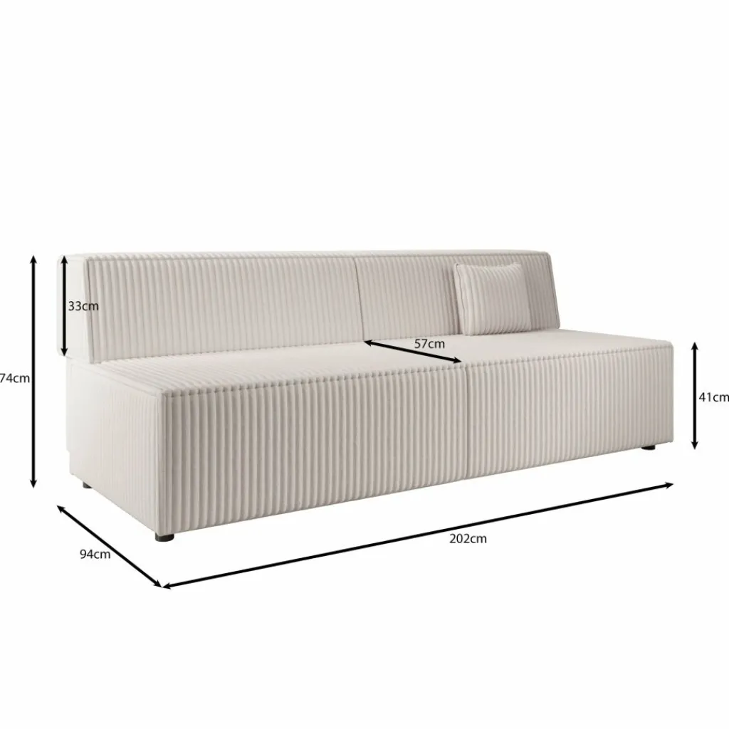 Tarella slaapbank is een compacte 3-zitsbank uitgevoerd in een beige fluffy teddystof en heeft een afmeting van 202x94x74 cm. Het ontwerp is recht en strak, met een doorlopende ribstructuur die zichtbaar is op zowel de zitting als de rugleuning.