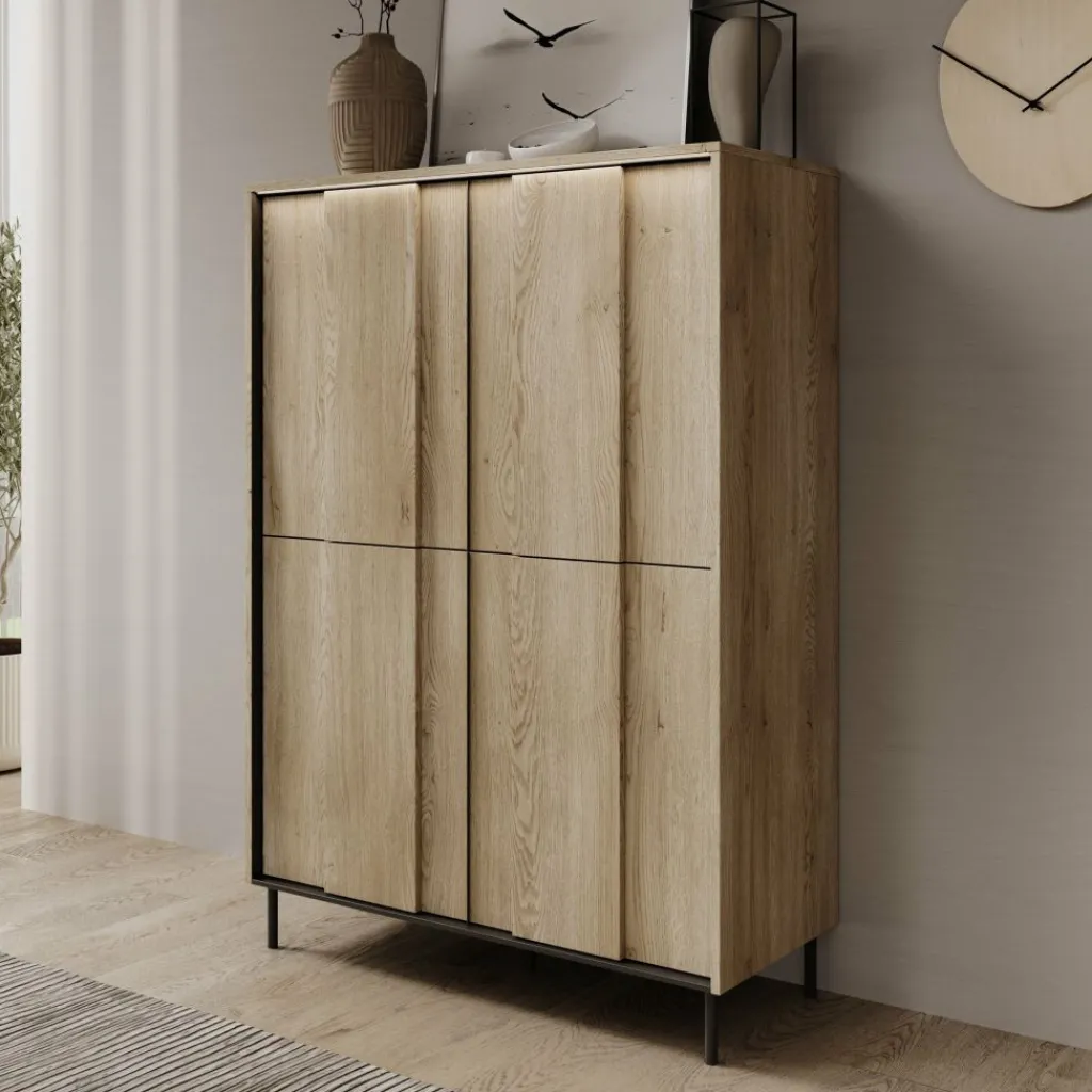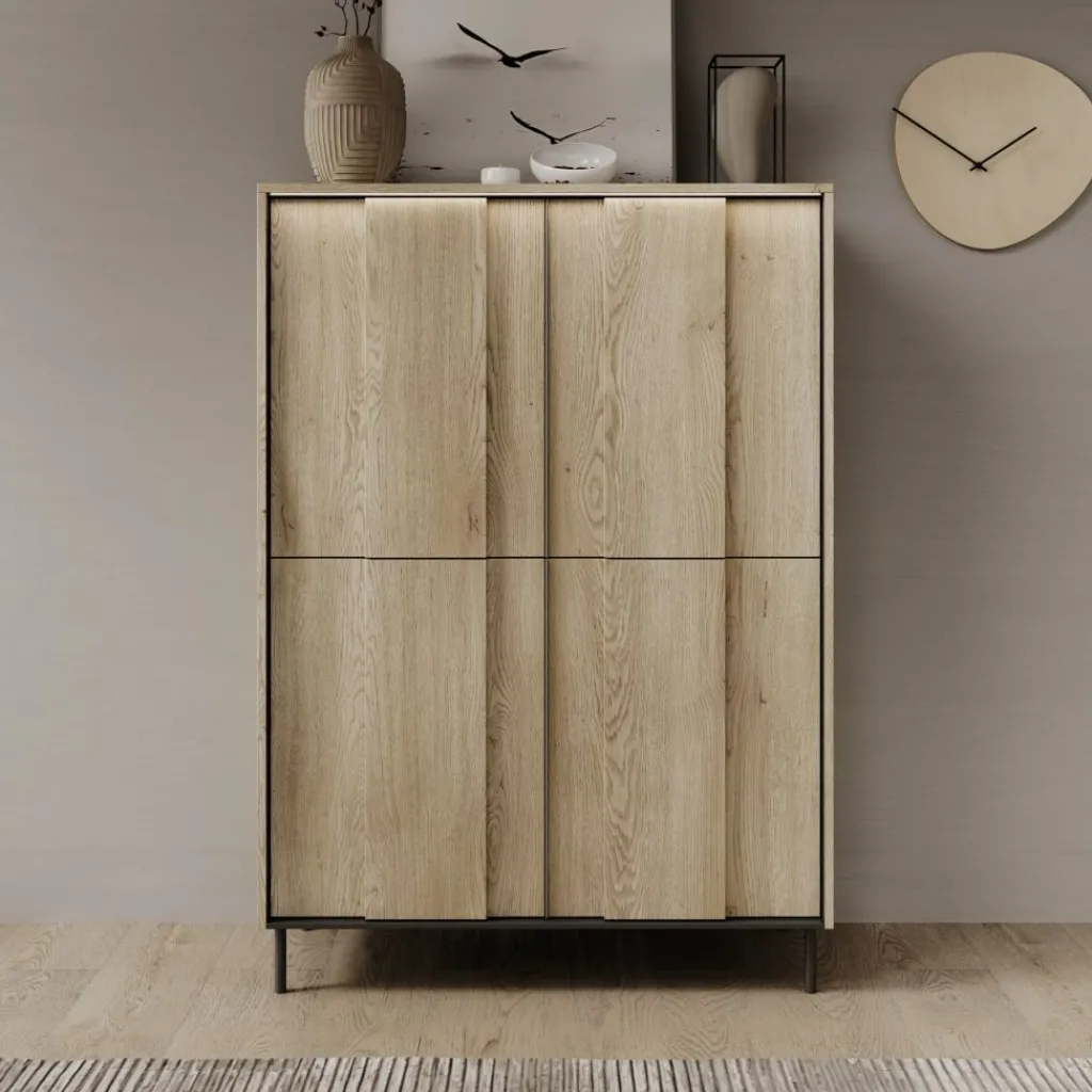 Dressoir Tarello is een staand opbergmeubel met een eikenpatroon en een afmeting van 99x41x140 cm. Het meubel is gemaakt van gelamineerd spaanplaat en staat op slanke, zwarte metalen poten. De strakke kastvorm en rechte lijnen zorgen voor een functionele en neutrale uitstraling die goed toepasbaar is in verschillende interieurs.