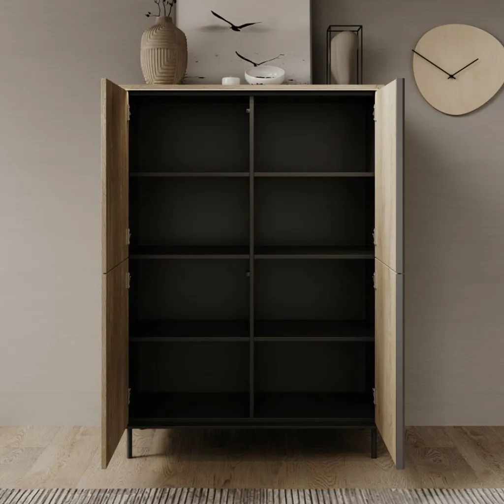 Het dressoir is voorzien van vier deuren. Achter deze deuren bevindt zich een indeling met meerdere opbergvakken, geschikt voor het overzichtelijk opbergen van servies, woonaccessoires of andere huishoudelijke spullen. De deuren openen naar links en rechts, waardoor de volledige binnenruimte goed bereikbaar is. Het bovenblad biedt extra ruimte voor decoratieve items zoals vazen of lijsten.