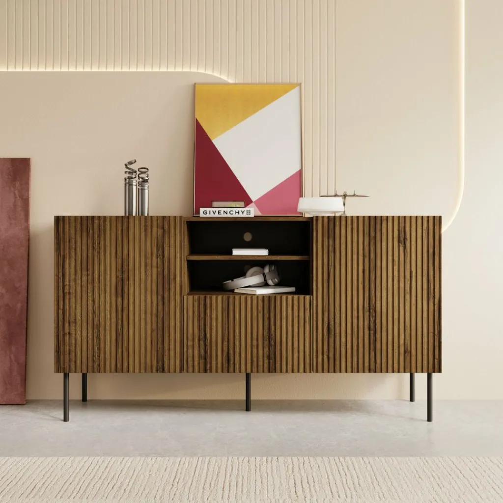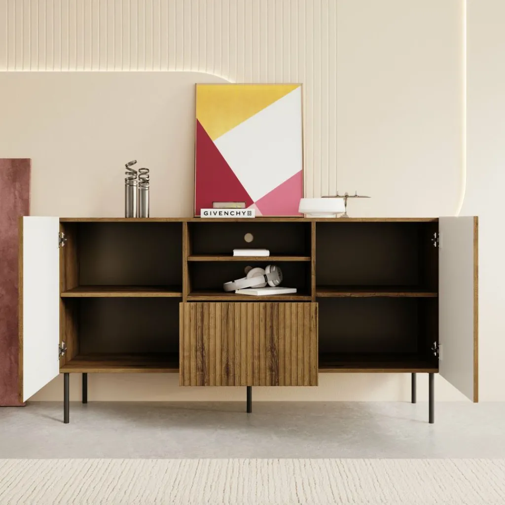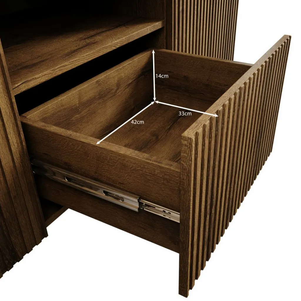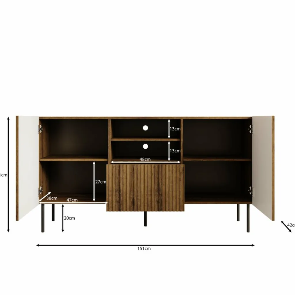 Dressoir Tartagal is een opbergkast in landelijke stijl. De kast beschikt over 1 lade en 2 deuren die die greeploos zijn. Achter de deuren zijn in totaal 4 opbergvakken te vinden. Ook heeft het meubel nog 2 open vakken. Achter ieder open vak zit in de achterwand een uitsparing om eventuele bedrading netjes te kunnen wegwerken.