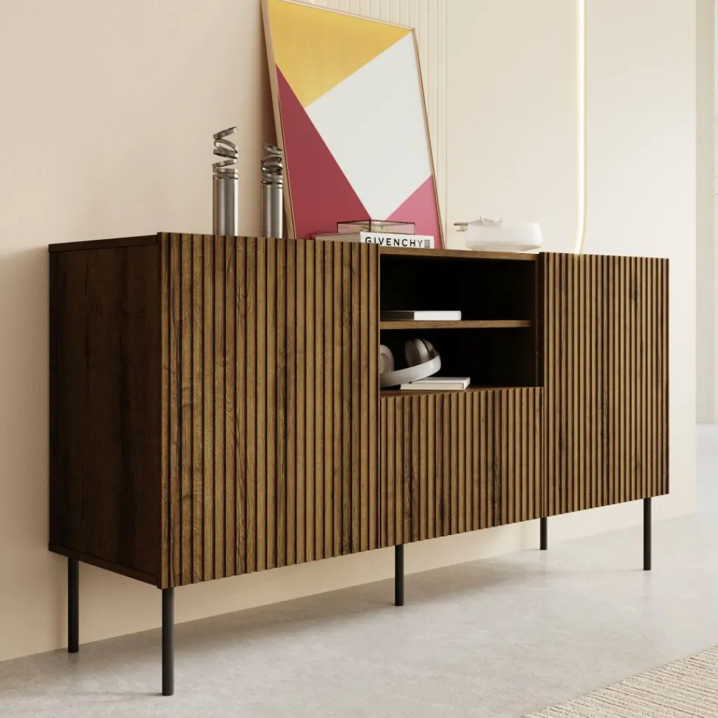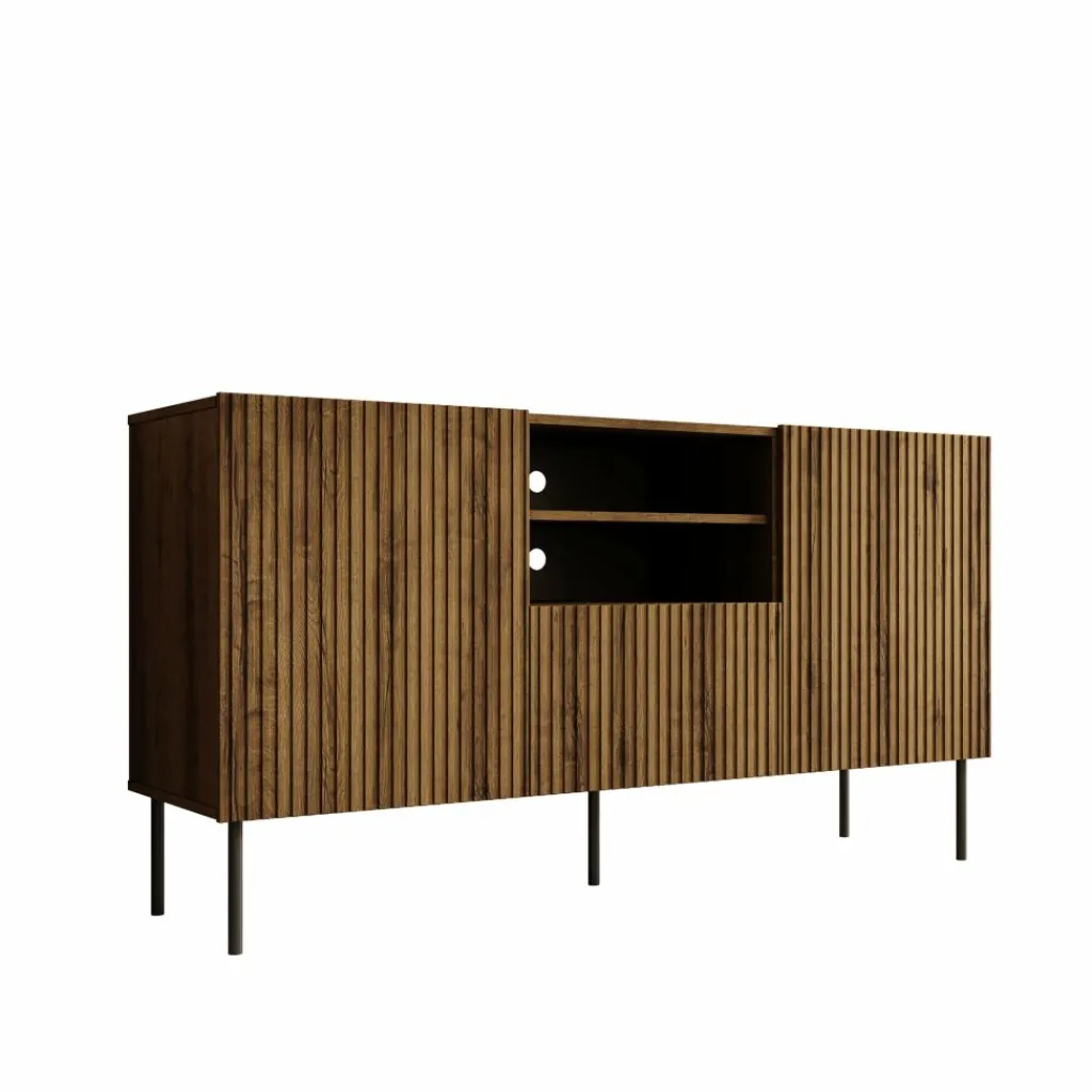 Het dressoir is uitgevoerd in een donkerbruin eiken kleur en de voorkant van de deuren beschikken over een latten patroon. Het meubel staat op metalen poten.