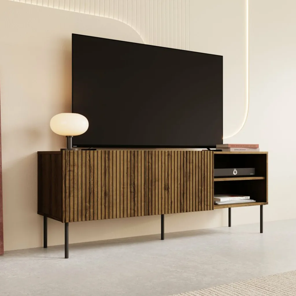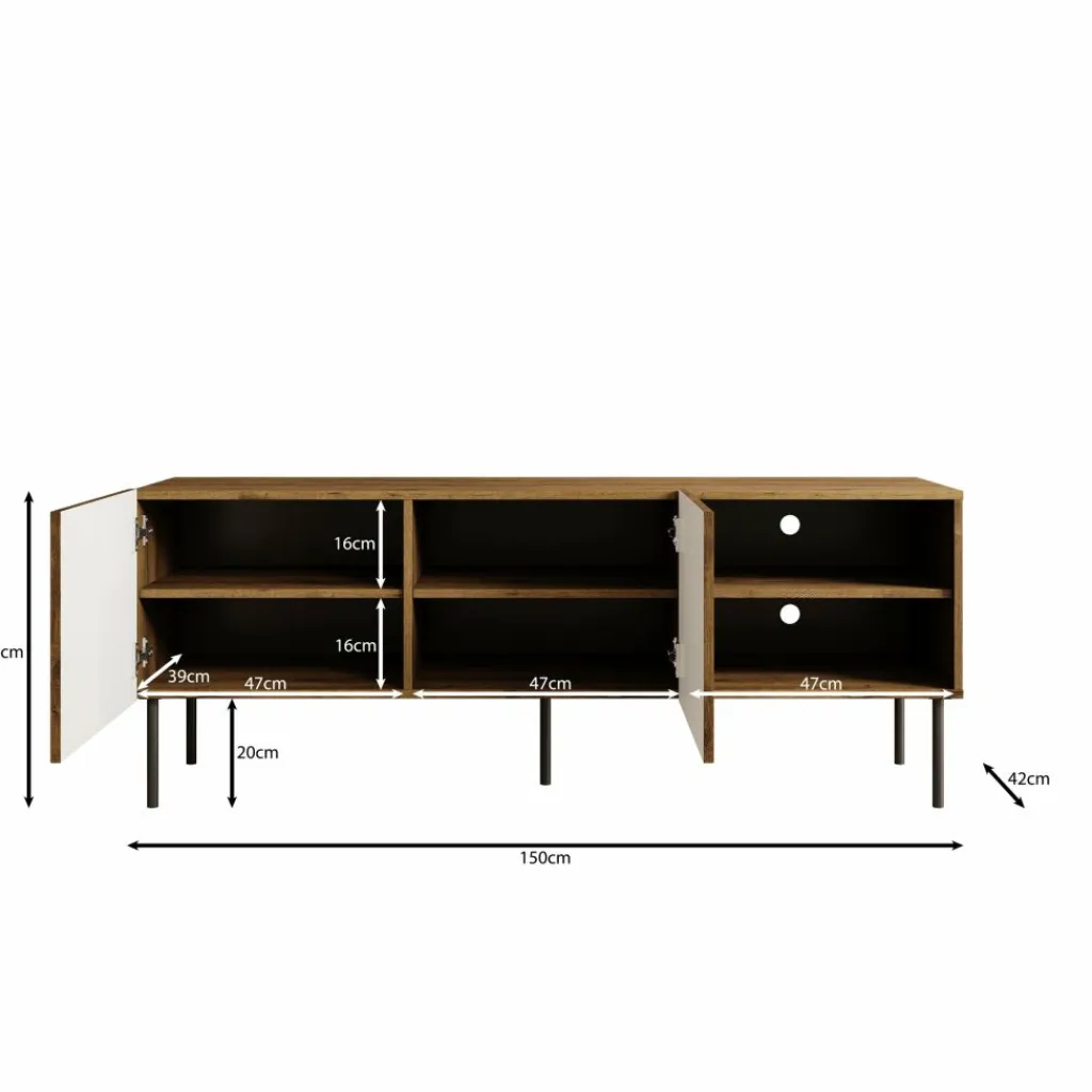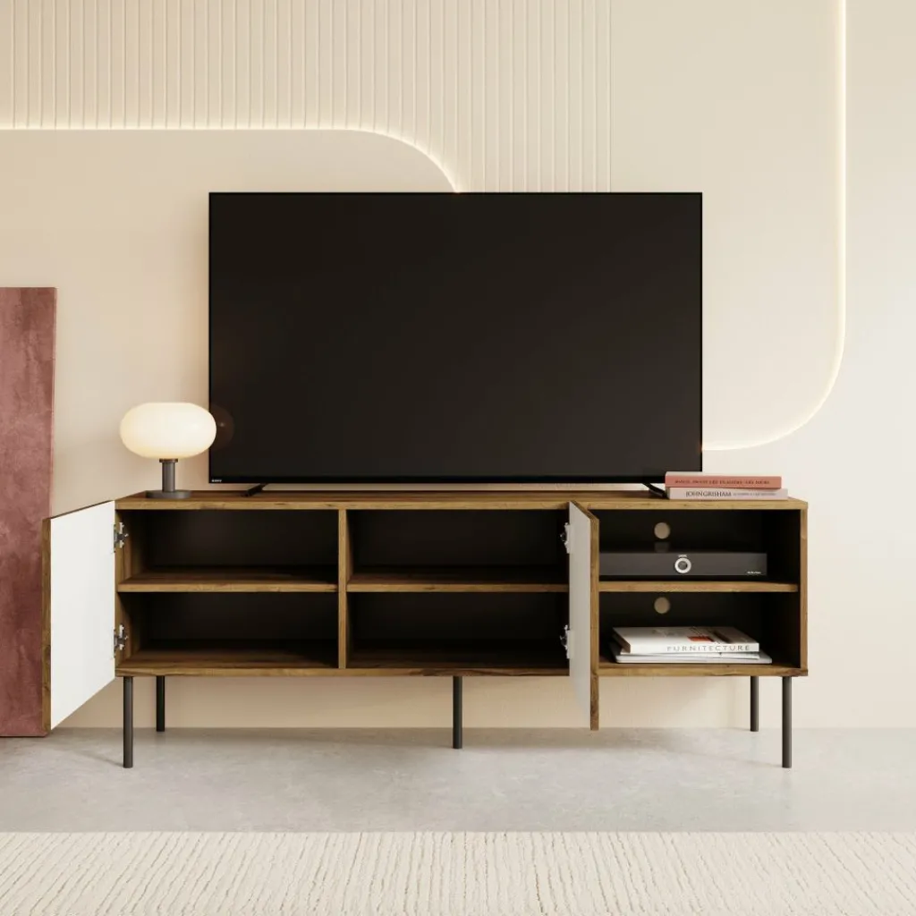 TV-Meubel Tartagal is een opbergkast voor onder de tv in een landelijke stijl. De TV kast beschikt over 2 deuren die greeploos zijn waarachter 4 opbergvakken zitten. Hiernaast zijn nog 2 open vakken te vinden. In deze open vakken zitten 2 uitsparingen in de achterwand om eventuele bedrading te kunnen wegwerken. Het meubel is uitgevoerd in een donkerbruin eiken kleur met zwarte poten. Deze poten zijn gemaakt van metaal.