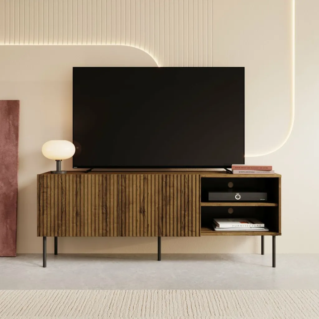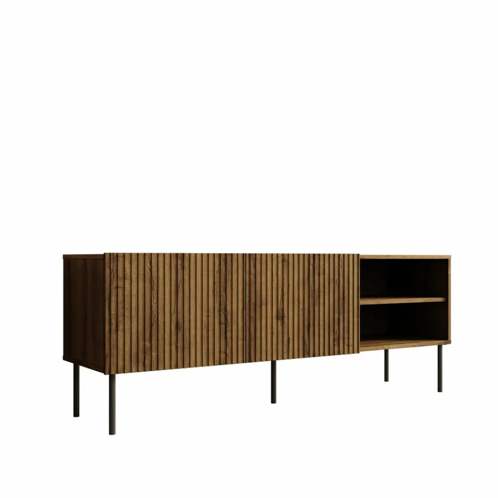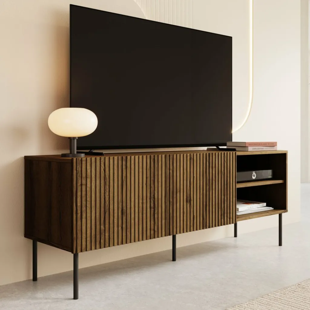 TV-Meubel Tartagal is een opbergkast voor onder de tv in een landelijke stijl. De TV kast beschikt over 2 deuren die greeploos zijn waarachter 4 opbergvakken zitten. Hiernaast zijn nog 2 open vakken te vinden. In deze open vakken zitten 2 uitsparingen in de achterwand om eventuele bedrading te kunnen wegwerken. Het meubel is uitgevoerd in een donkerbruin eiken kleur met zwarte poten. Deze poten zijn gemaakt van metaal.