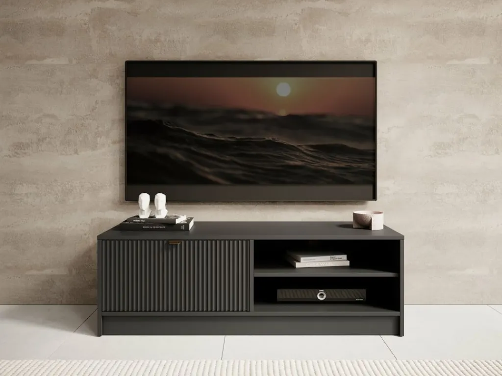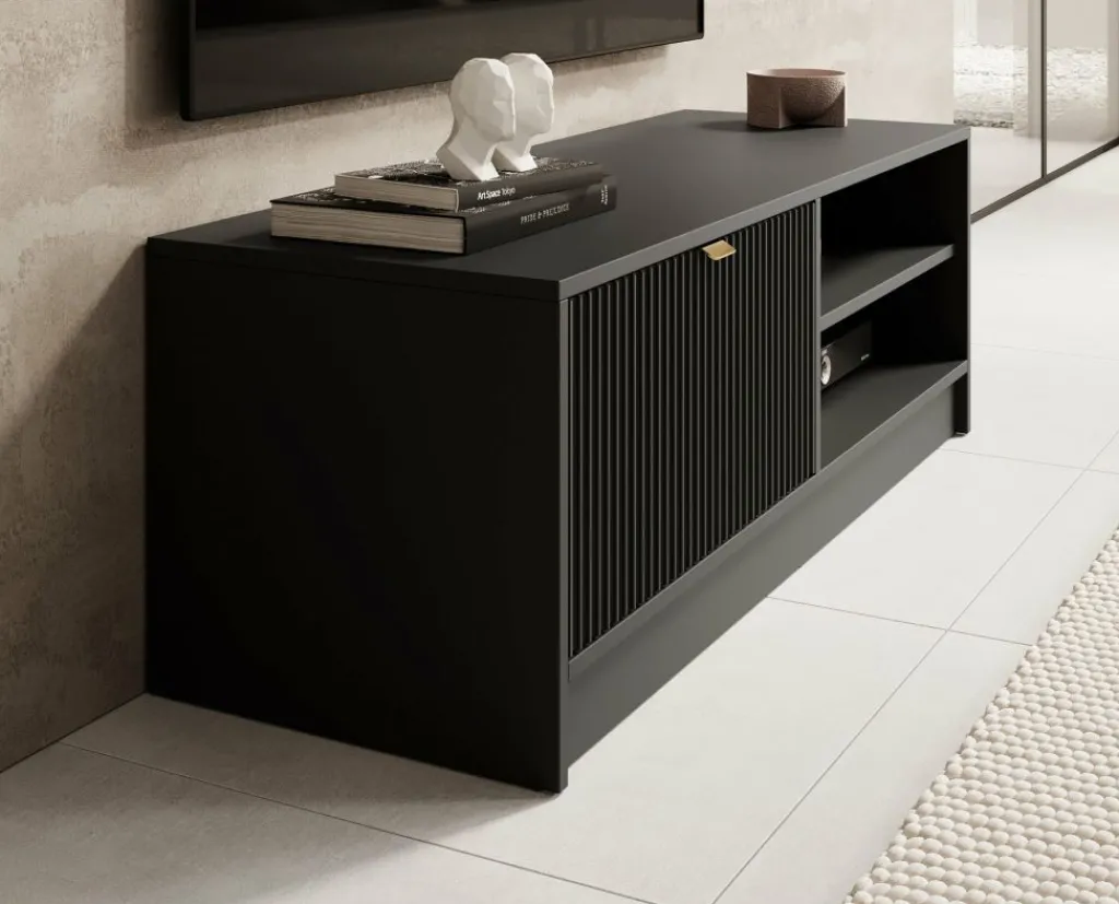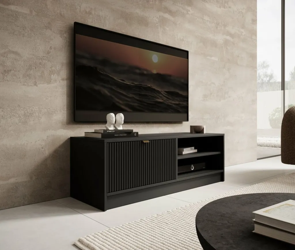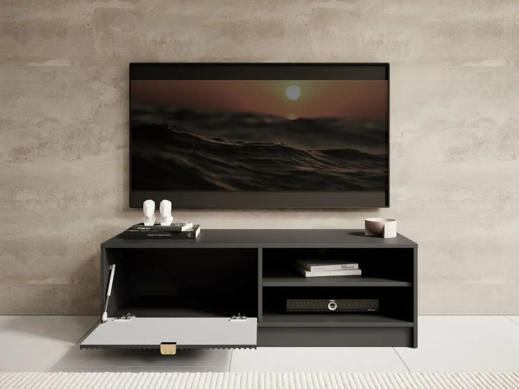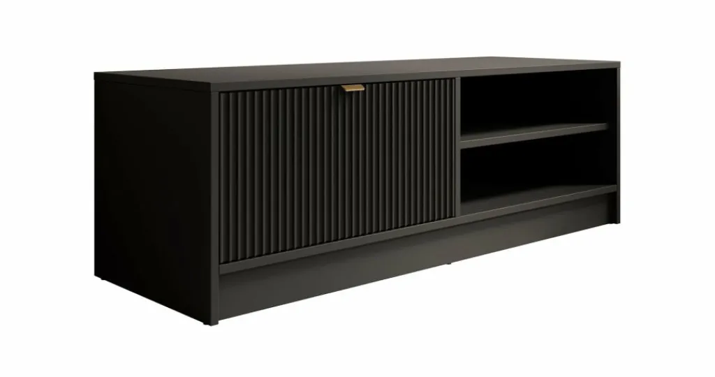 TV-Meubel Tavares is een modern tv-meubel in hotel-chique stijl. Het meubel is gemaakt van een stevige spaanplaat constructie in zwarte kleur.