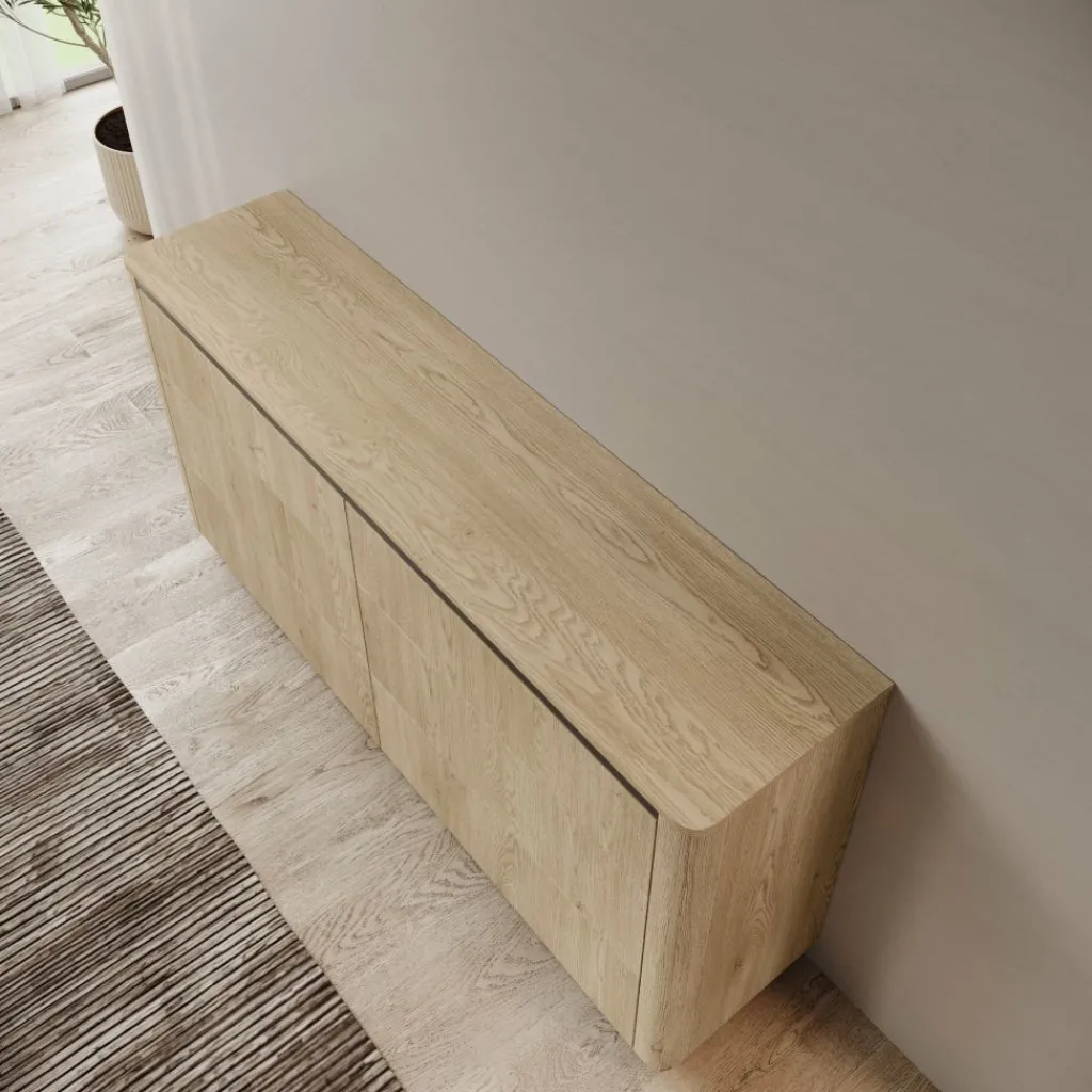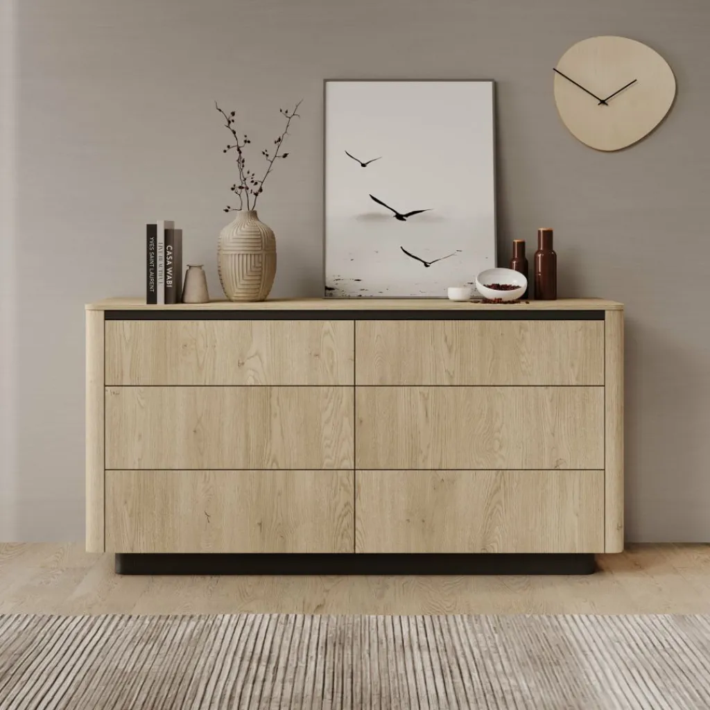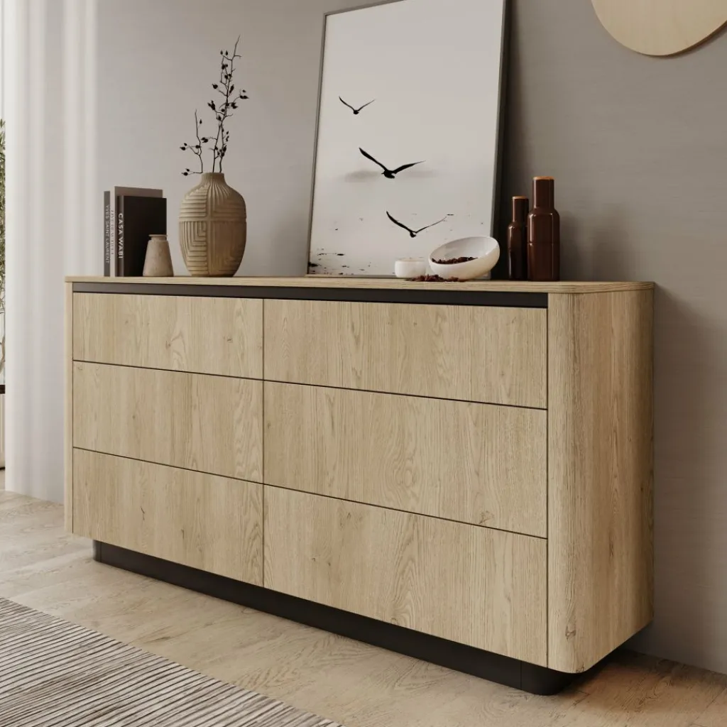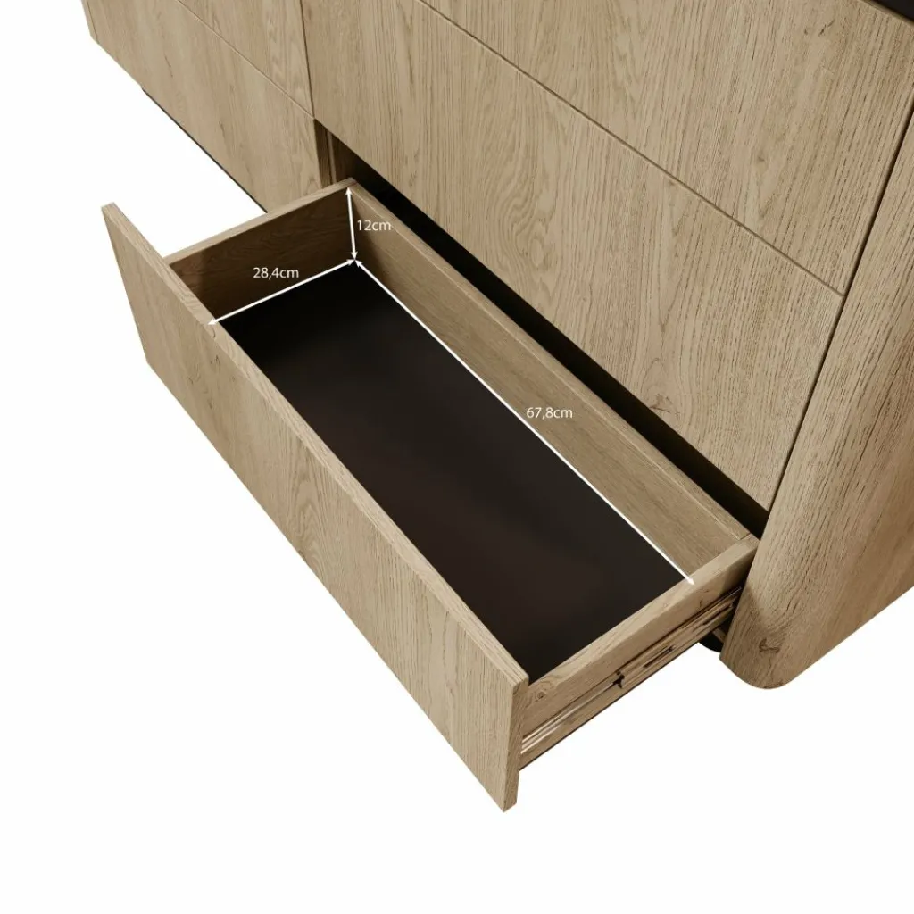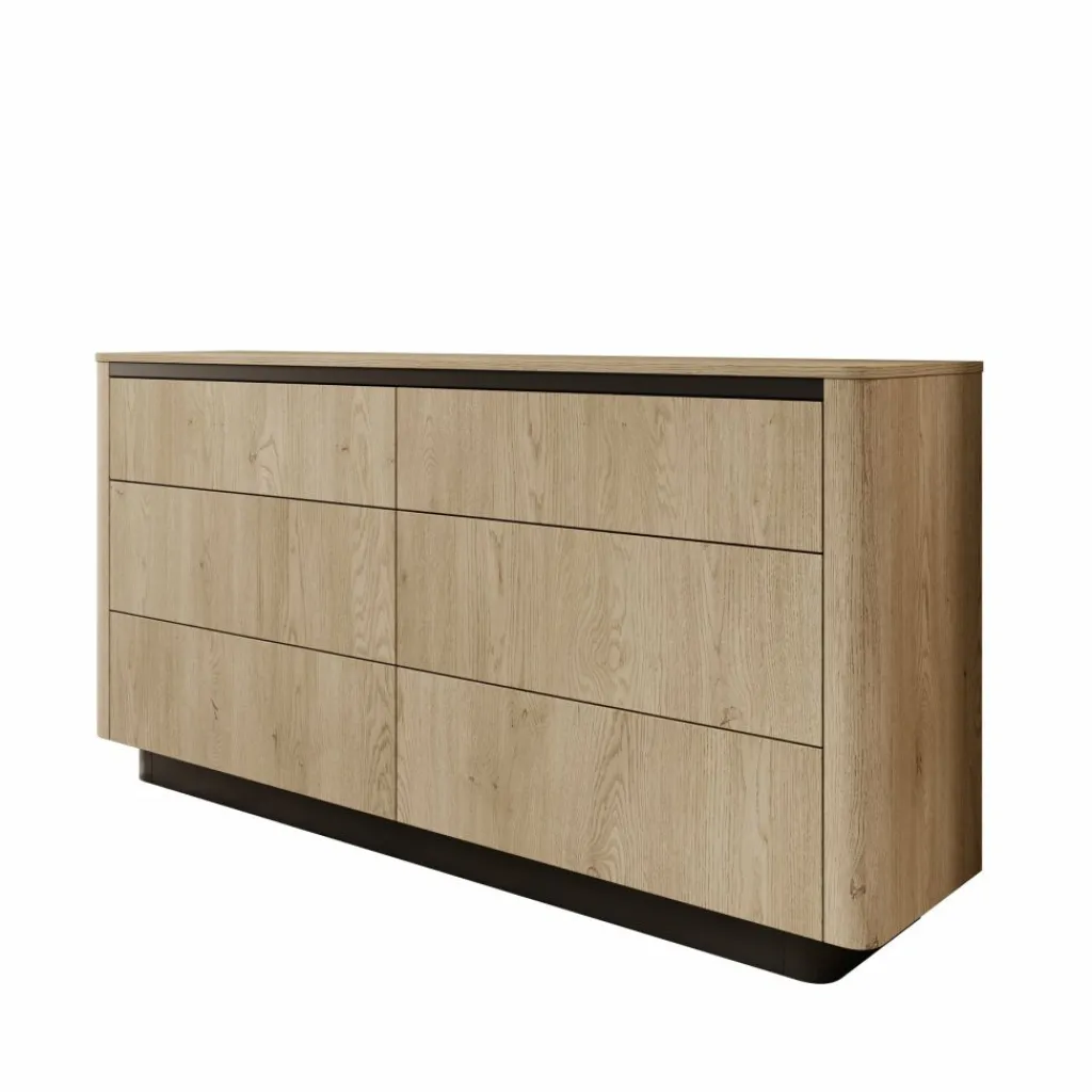 De Taywan ladekast in eiken heeft een strak en evenwichtig ontwerp. De natuurlijke houtkleur en afgeronde hoeken geven het meubel een rustige uitstraling, terwijl de donkere plint en bovenrand zorgen voor een stijlvol contrast.