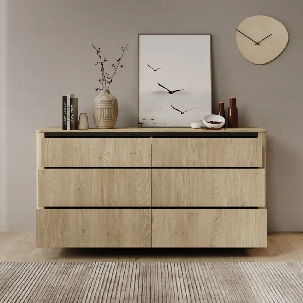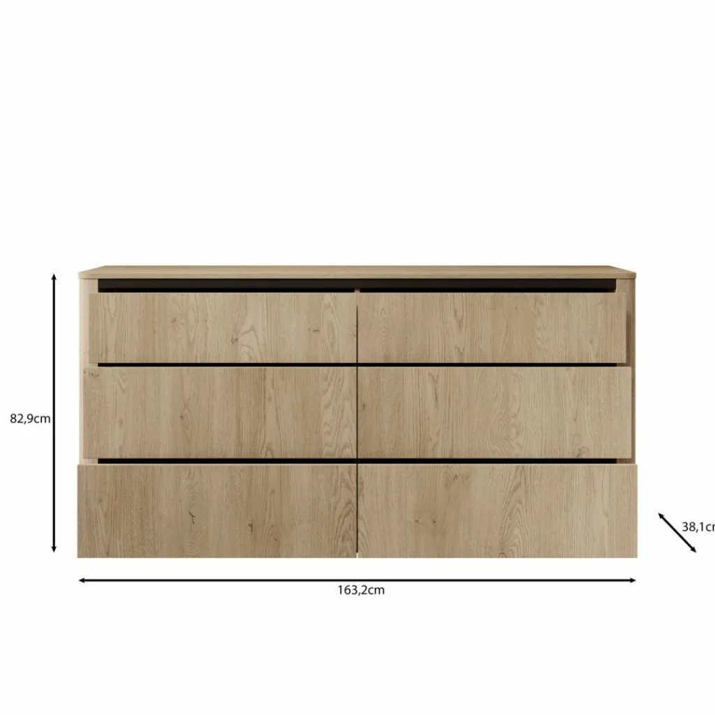 De kast beschikt over zes ruime lades die veel opbergruimte bieden voor kleding, linnengoed of accessoires. De fronten lopen naadloos in elkaar over, waardoor het geheel een strak en samenhangend uiterlijk krijgt.