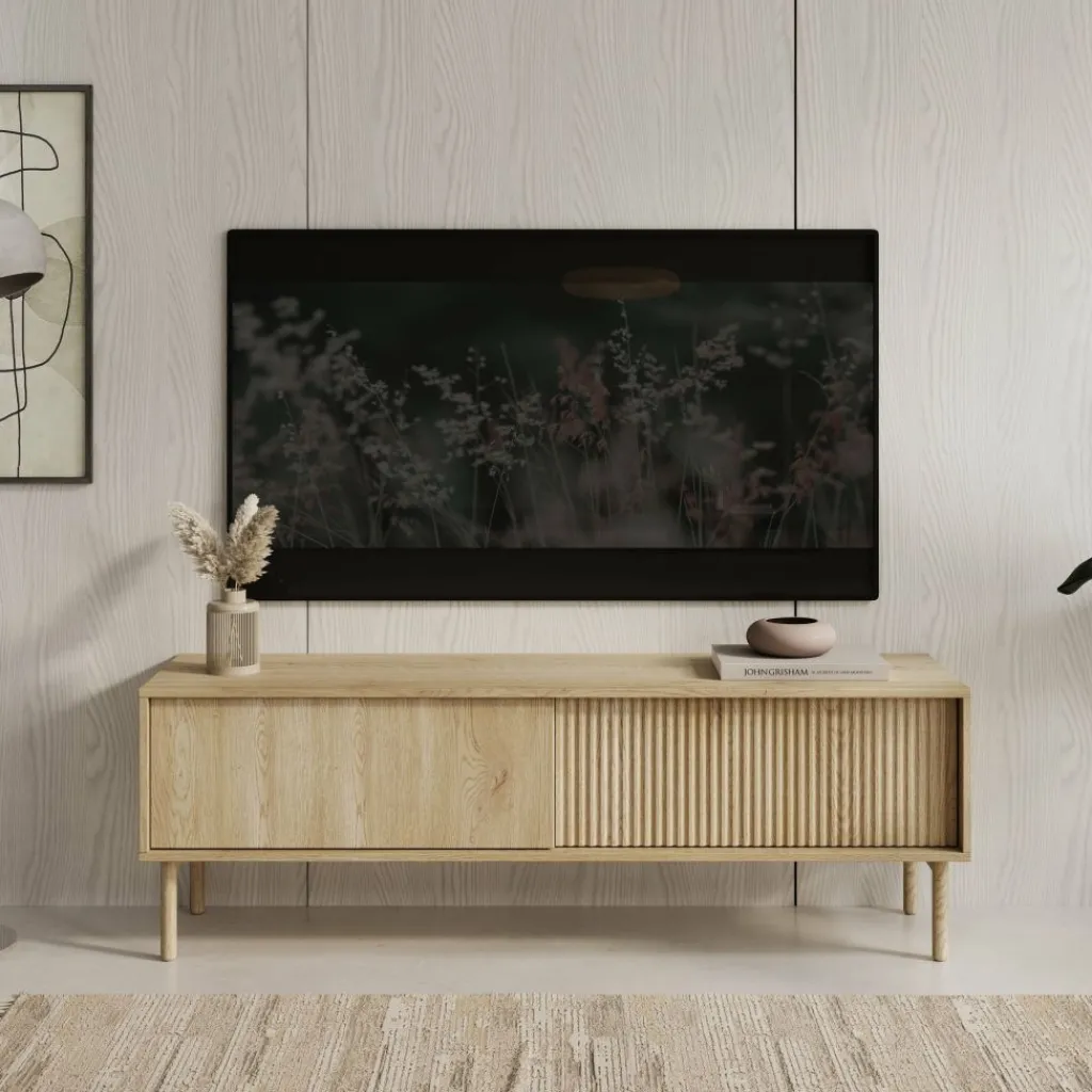 Het tv-meubel biedt voldoende ruimte voor audiovisuele apparatuur en accessoires. De gesloten opbergruimte zorgt ervoor dat kabels en apparatuur netjes uit het zicht blijven. Dankzij het tijdloze ontwerp past het Tenerife tv-meubel goed in verschillende interieurstijlen en is het geschikt voor diverse woonruimtes.
