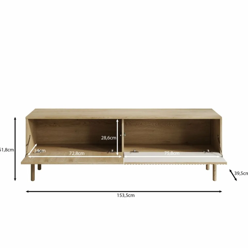 Het Tenerife tv-meubel van Meubella is uitgevoerd in eikenlook en heeft een afmeting van 154 x 40 x 55 centimeter. Het meubel heeft een moderne vormgeving met een combinatie van gladde en verticaal gefreesde fronten. De hoge poten zorgen voor een open uitstraling en maken het eenvoudig om onder het meubel schoon te houden.