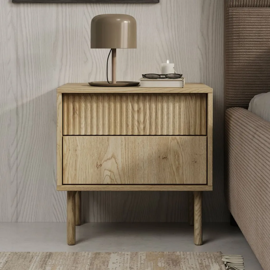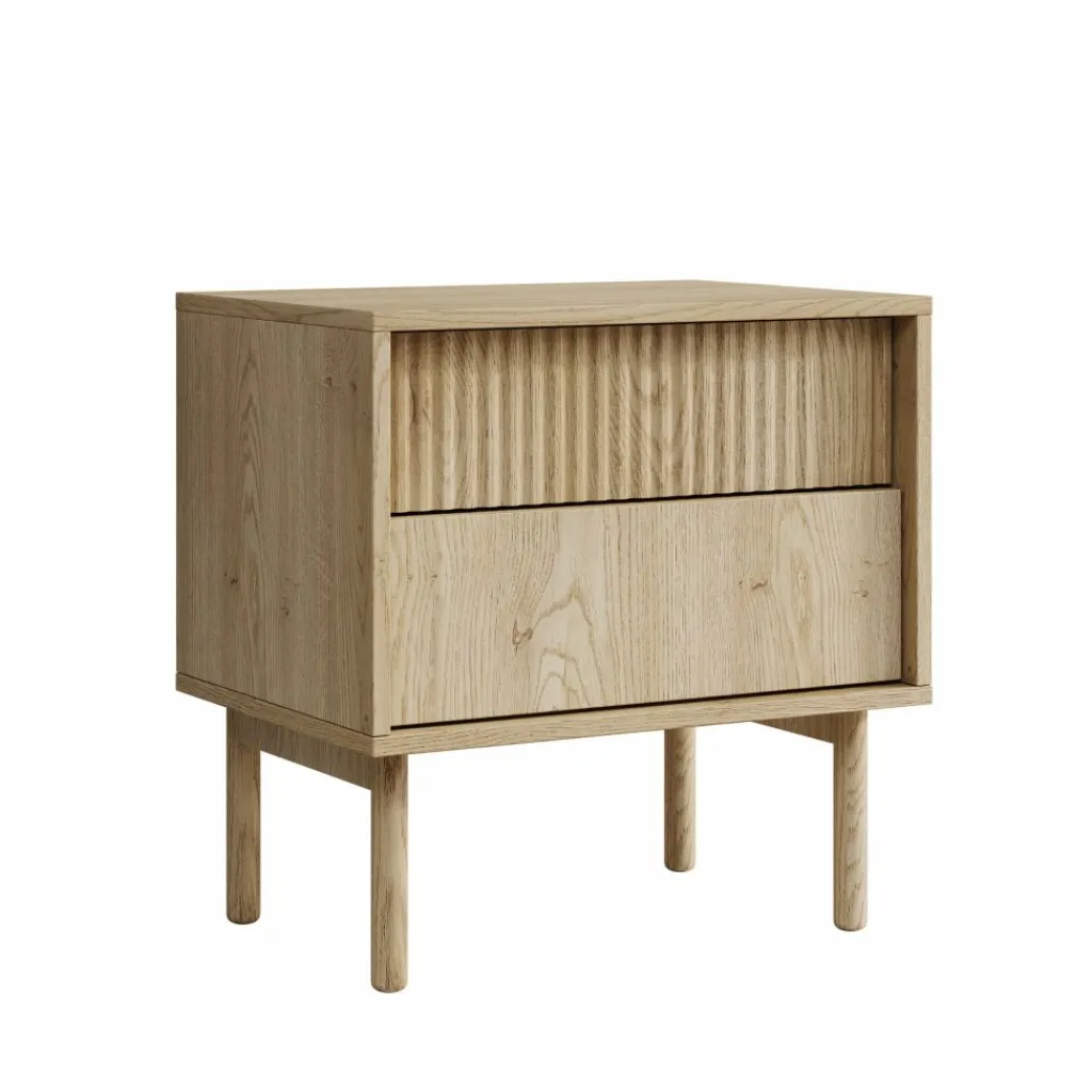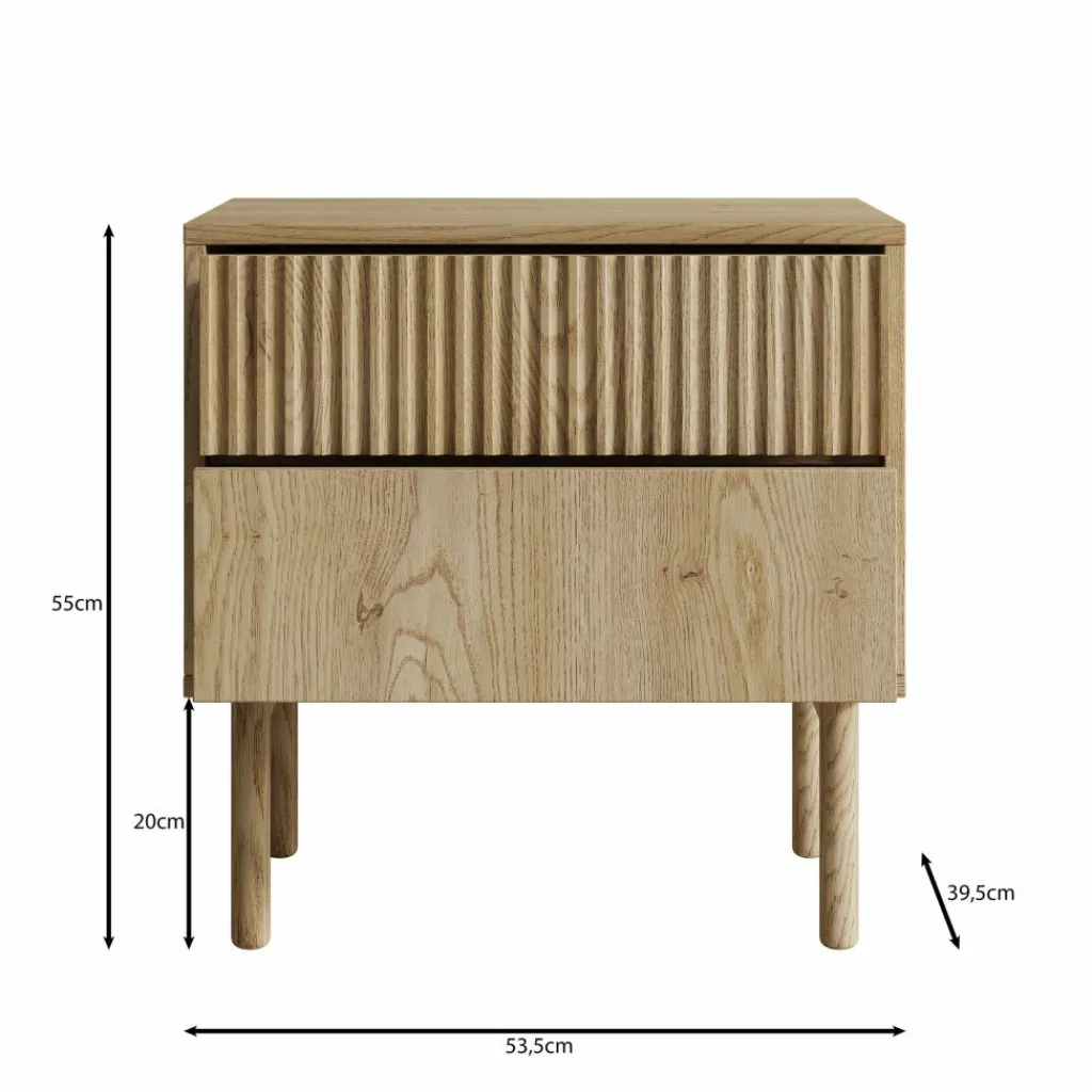 Het nachtkastje Tenerife heeft een eikenlook afwerking en een strak, rechtlijnig ontwerp. De bovenste lade is voorzien van een verticale latstructuur die zorgt voor een rustig en evenwichtig geheel.