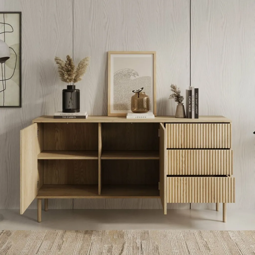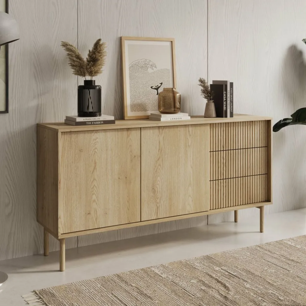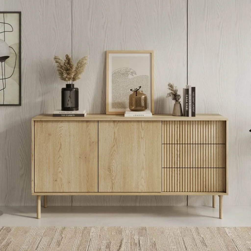 Het dressoir Tenerife heeft een eiken afwerking met een combinatie van gladde en verticaal gelijnde fronten. De kast beschikt over twee deuren en drie lades, die samen praktische opbergruimte bieden voor verschillende spullen.