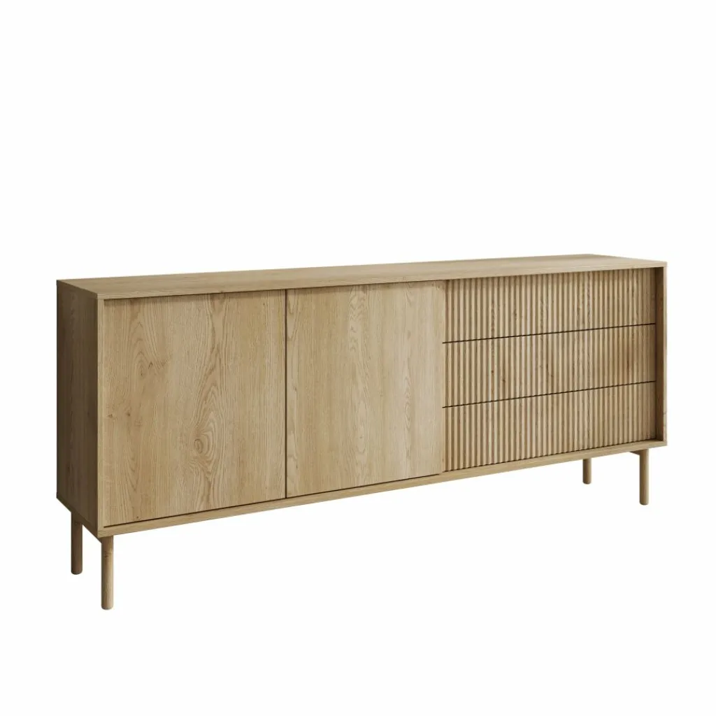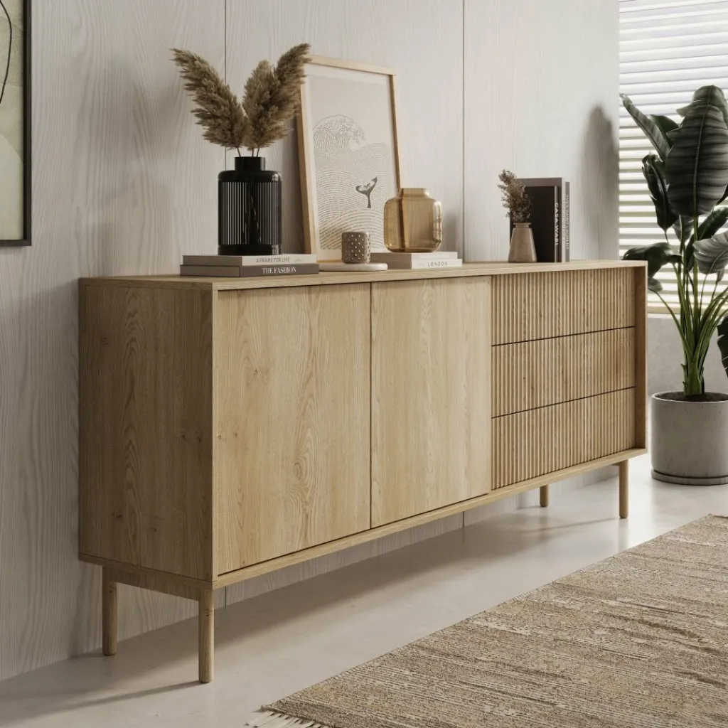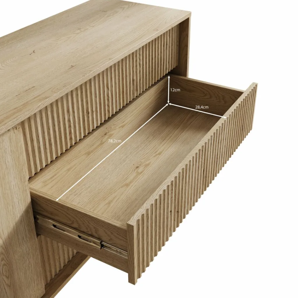 Het dressoir Tenerife heeft een eikenlook afwerking met een combinatie van gladde en verticaal gelijnde fronten. De kast is voorzien van twee deuren en drie lades, die samen zorgen voor praktische opbergruimte.