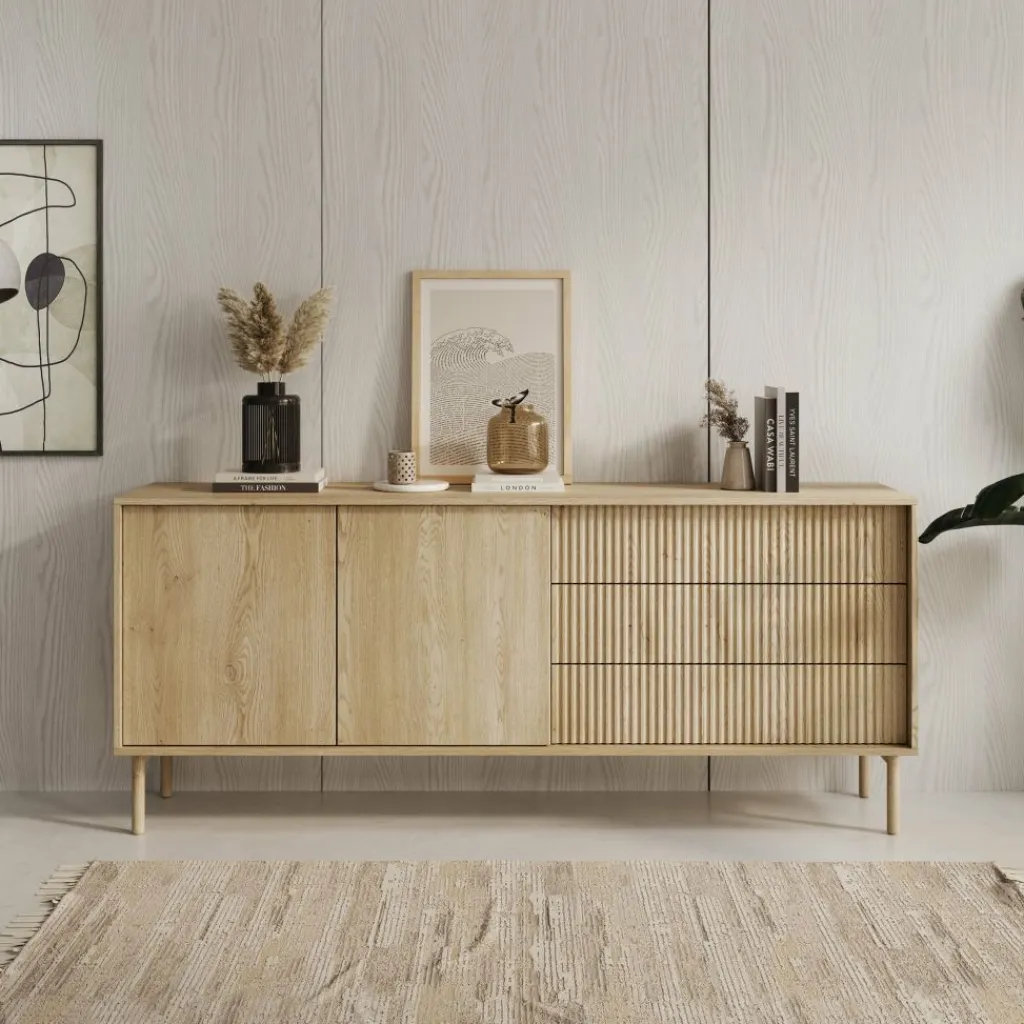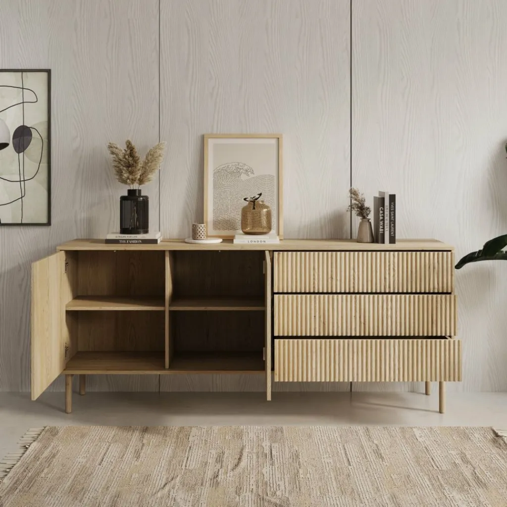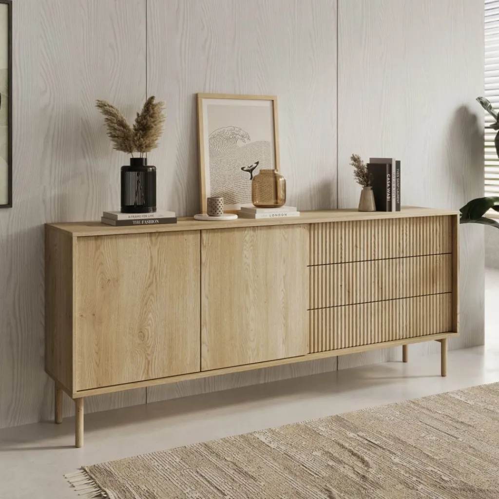 Het dressoir Tenerife heeft een eikenlook afwerking met een combinatie van gladde en verticaal gelijnde fronten. De kast is voorzien van twee deuren en drie lades, die samen zorgen voor praktische opbergruimte.