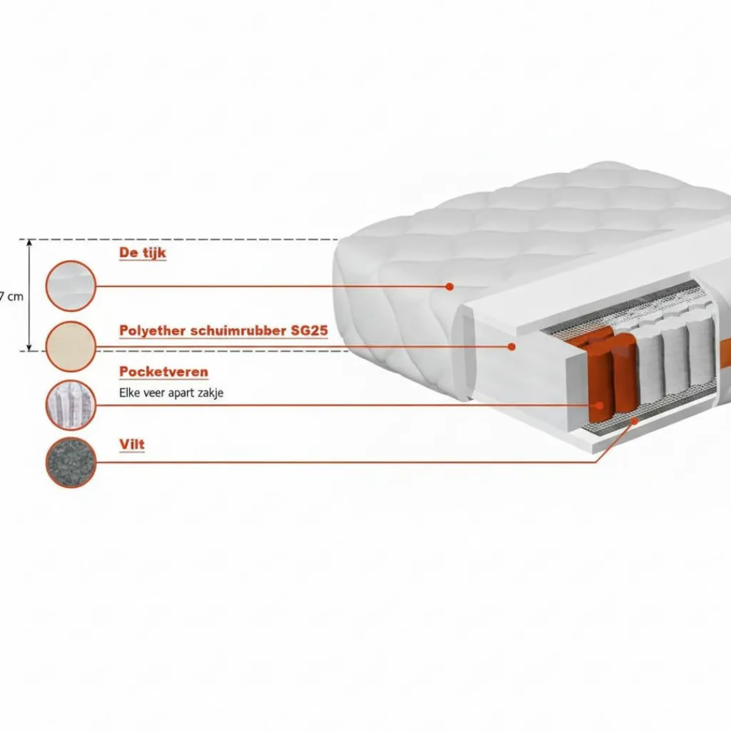 Het matras bestaat uit pocketveren. De pocketveer is stiller dan de klassieke veer en sluit het effect van zone-uitwijking uit waardoor het matras zich beter aanpast aan de vorm van het lichaam. De veren verdelen het matras in 7 zones, elk met voldoende ondersteuning voor een bepaald deel van het lichaam. De veren werken onafhankelijk van elkaar, zodat twee naast elkaar slapende mensen geen ongemak ervaren door de bewegingen van de andere persoon. Het matras wordt ook aanbevolen voor mensen met verschillende lichaamsgewichten, omdat het matras niet naar de andere persoon buigt. Per m2 bevinden zich 262 veren.