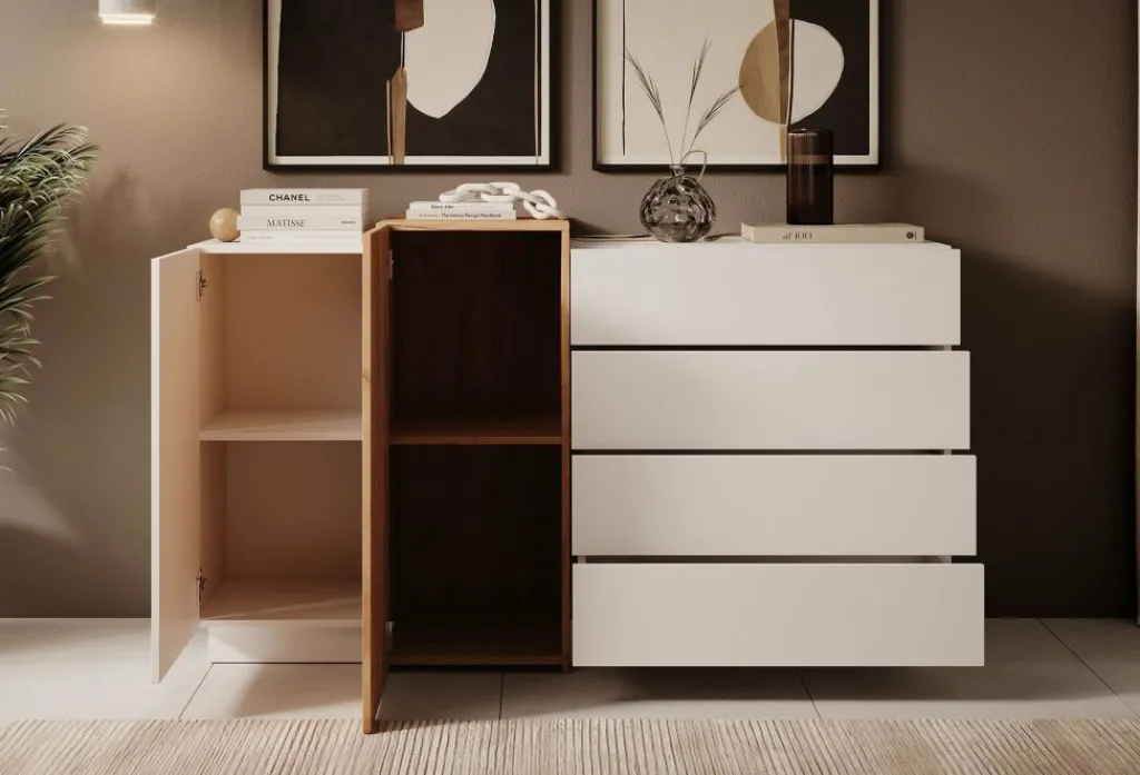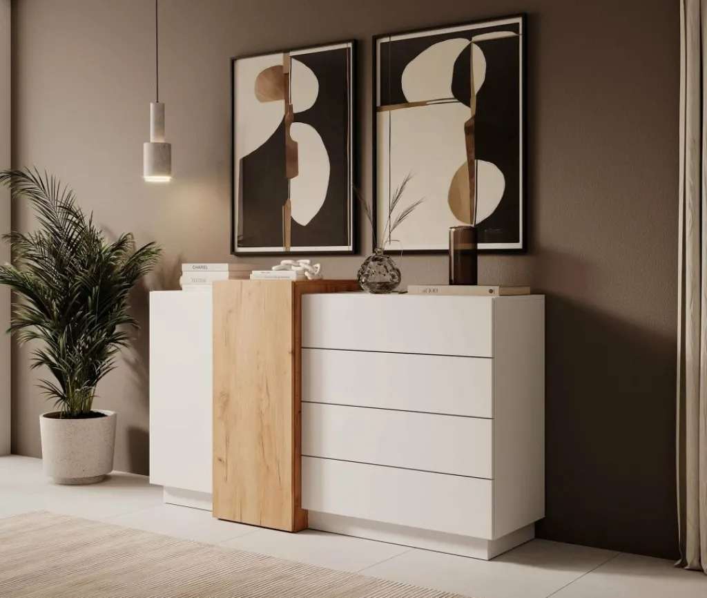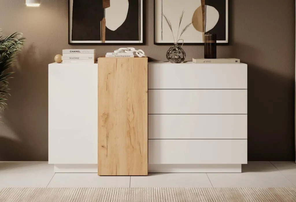 Commode Three is een moderne kast uitgevoerd in een witte en eiken kleur. Het dressoir beschikt over 4 lades en 2 klepdeuren. Deze zijn te openen middels een push to open systeem.