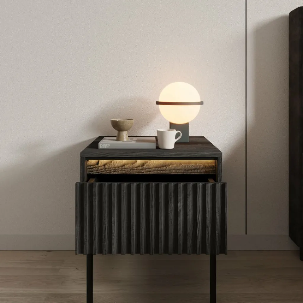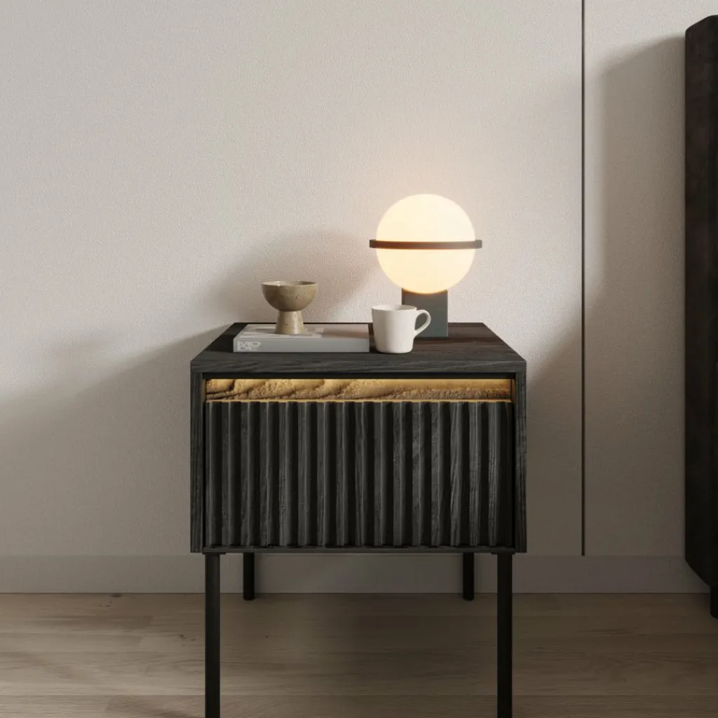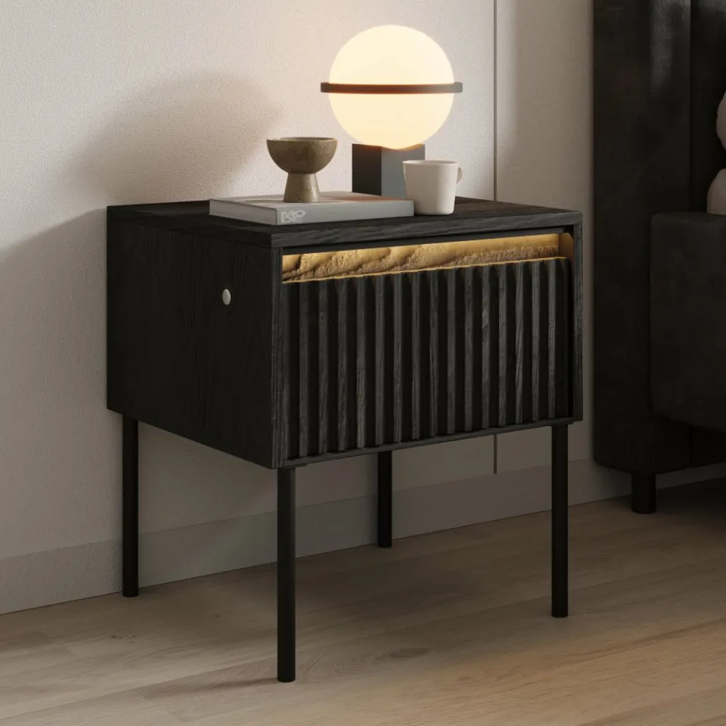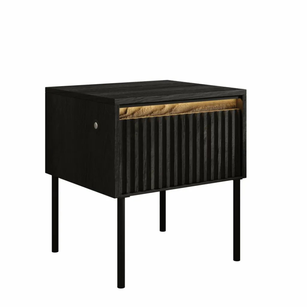 Het Timoteo nachtkastje in zwart heeft een strak en modern ontwerp voor naast het bed. De combinatie van het zwarte front met verticale lijnen en het minimalistische metalen onderstel zorgt voor een krachtige en eigentijdse uitstraling.