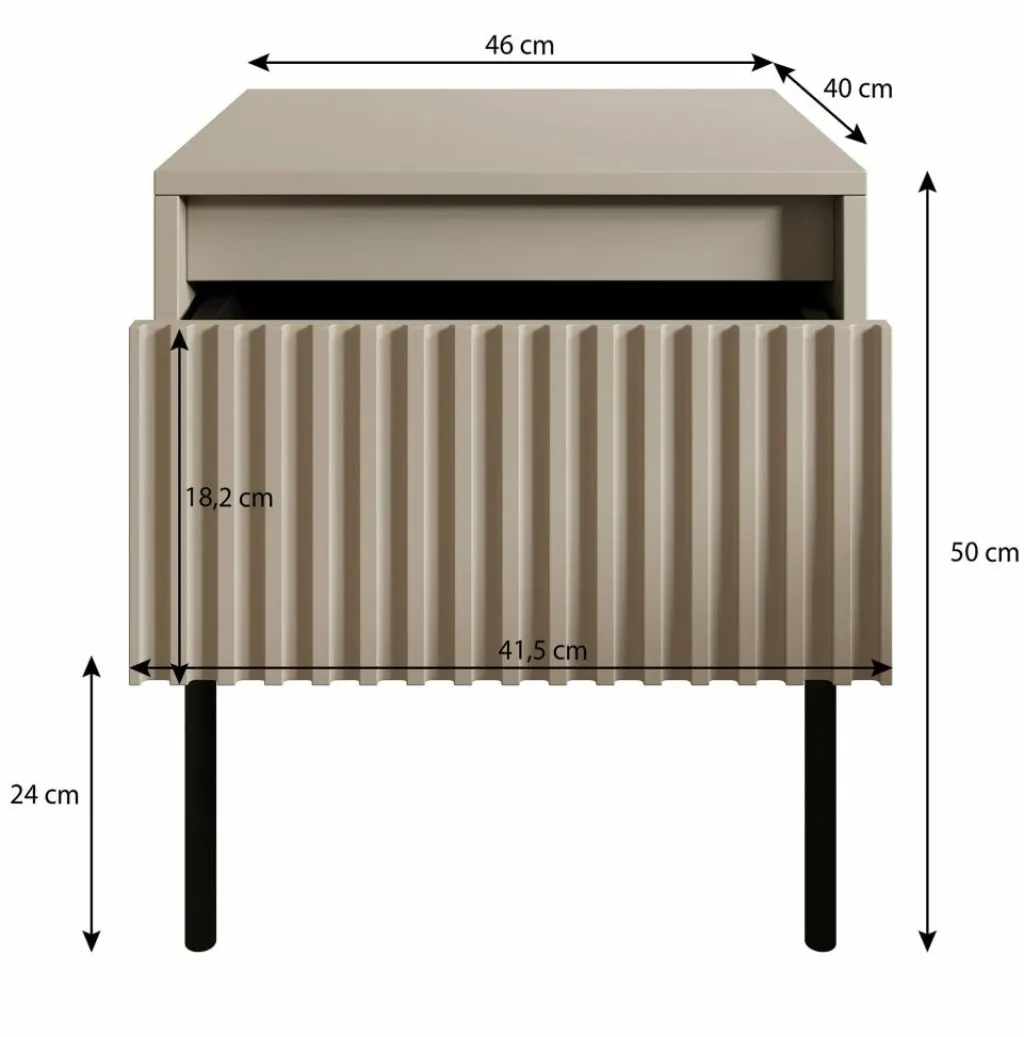 Het kastje beschikt over praktische opbergruimte voor spullen die je binnen handbereik wilt houden. Met zijn afmetingen van 46x40x50 cm past dit model in diverse slaapkameropstellingen en is het eenvoudig te combineren met andere meubels.