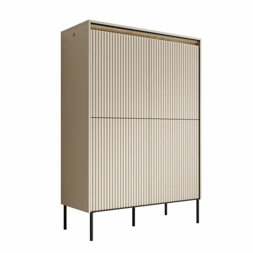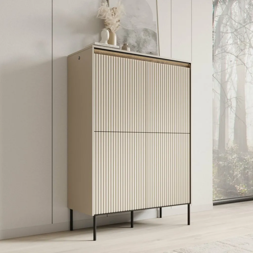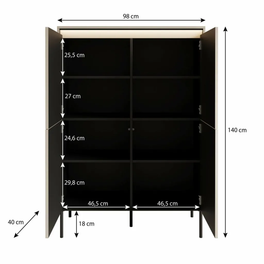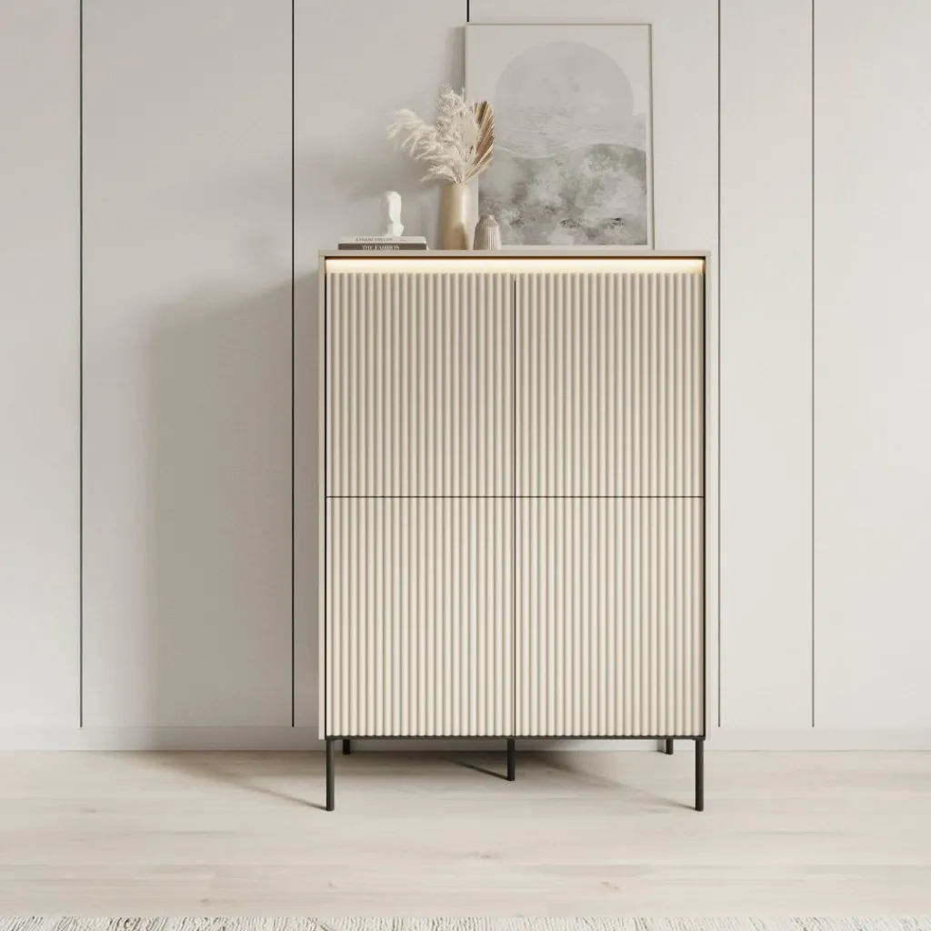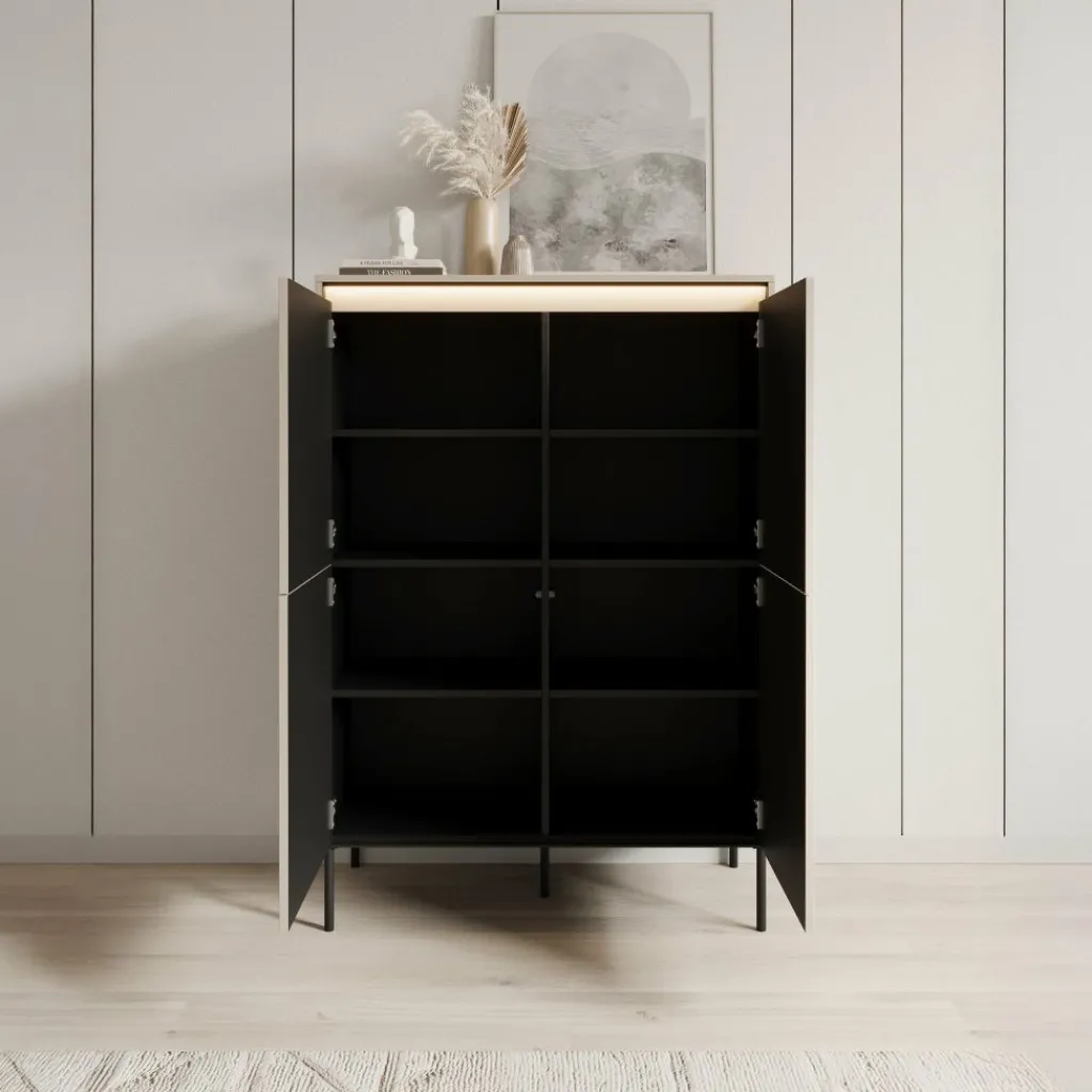 De kast heeft 4 deuren. De deuren zijn greeploos en openen via een push-to-open systeem. Achter de deuren zitten 8 opbergvakken. Het dressoir beschikt over LED-verlichting.